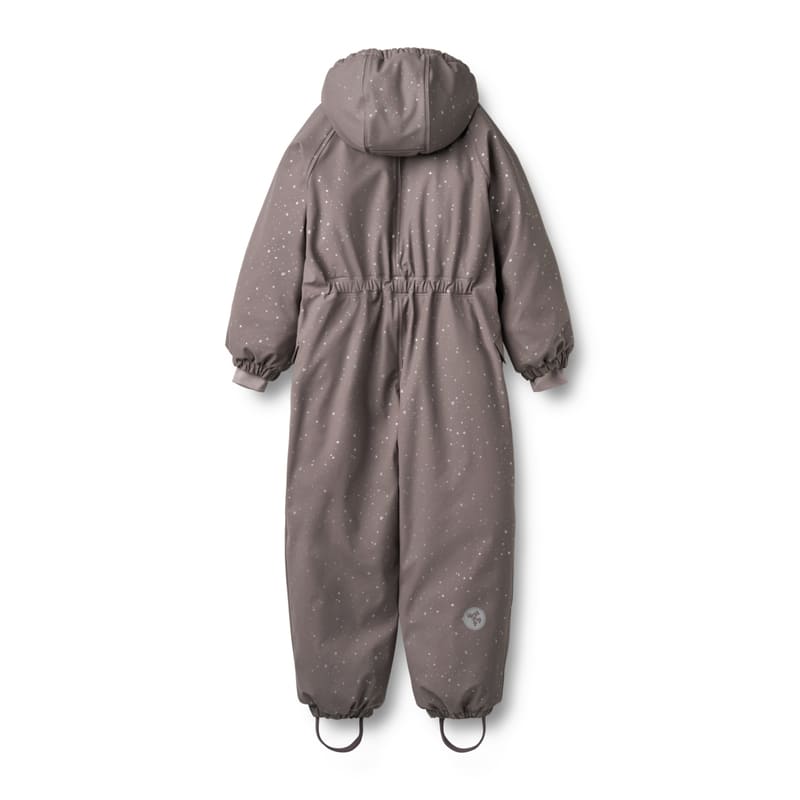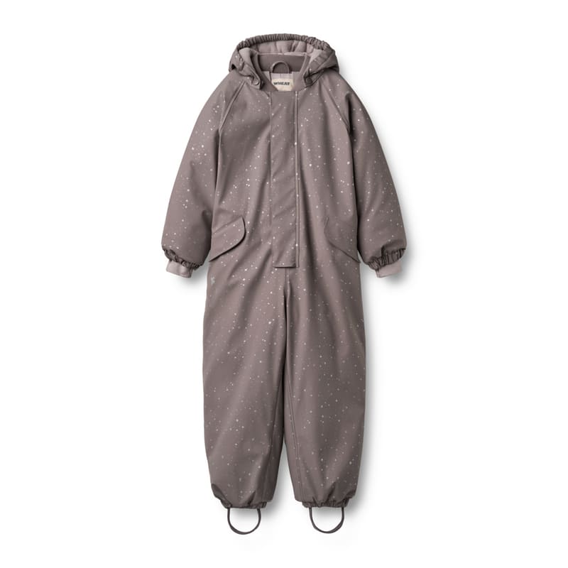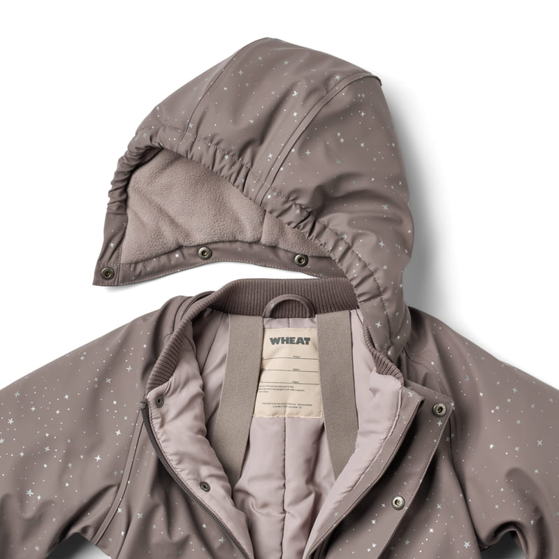 Темный лиловый цвет и узор звёзд создают атмосферу волшебной зимней ночи. Этот комбинезон надёжен: не промокает, не продувается и отлично сохраняет тепло. Эргономичный крой не сковывает движения, а манжеты, капюшон и подкладка обеспечивают комфорт в любую погоду. Подходит для длительных прогулок, снежных горок и игр на улице даже в самые холодные дни.
