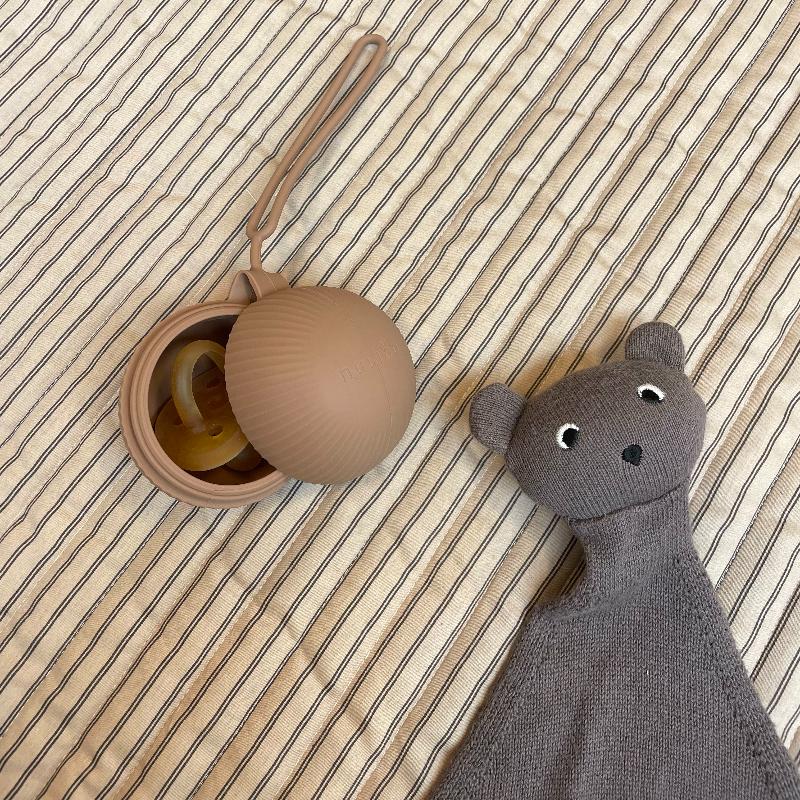 Силиконовый контейнер сохраняет пустышки чистыми в сумке или коляске. Насыщенный шоколадный цвет выглядит стильно и не маркий. Вмещает две-три пустышки или комбинацию из пустышки и держателя. Удобный ремешок позволяет закрепить контейнер на ручке коляски или сумке. Материал безопасен, легко моется, быстро сохнет благодаря вентиляционным отверстиям.