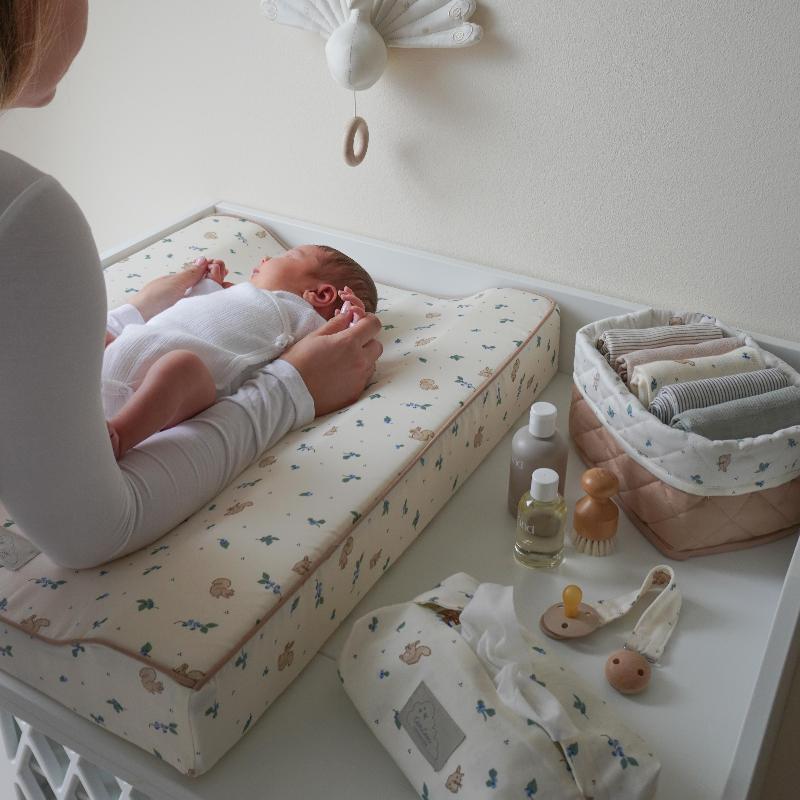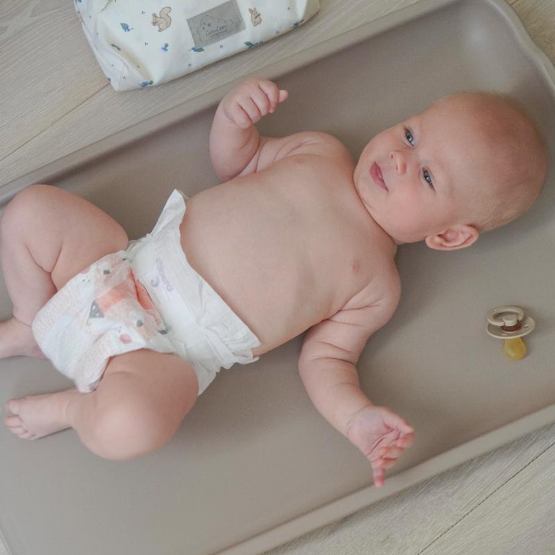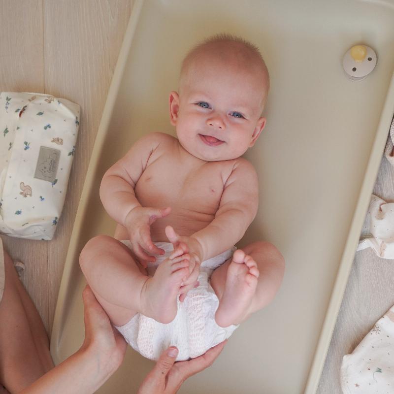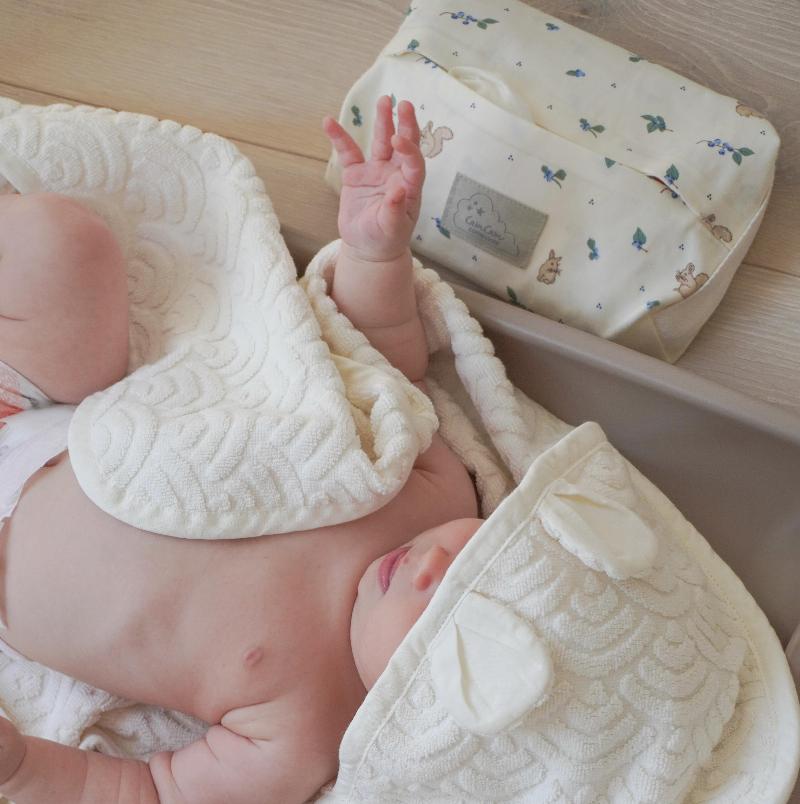 Дополнительная информация: подходит для большинства упаковок влажных салфеток стандартных размеров и может использоваться на пеленальном столике или в сумке для подгузников в дороге, снабжен практичным ремешком для переноски. GOTS.