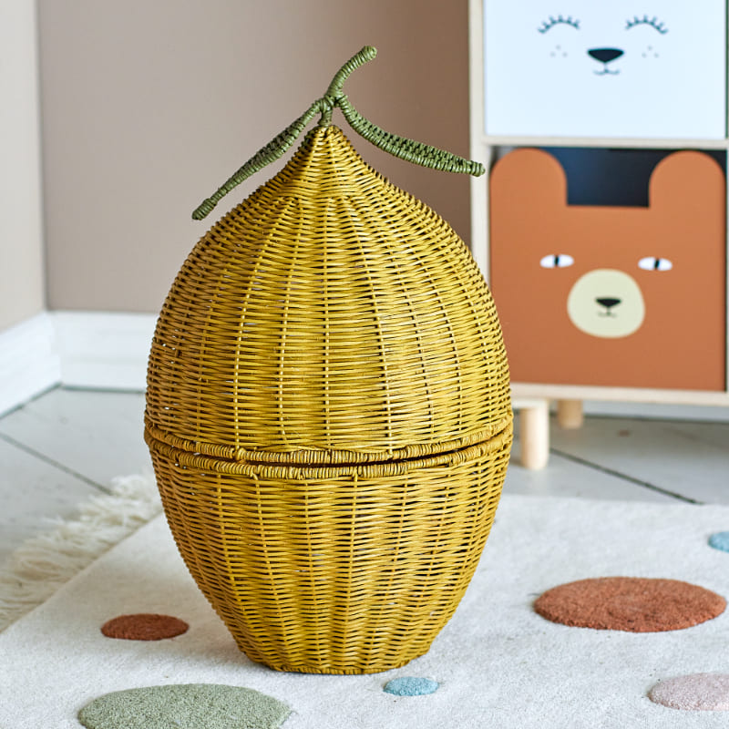 Плетёная корзина с крышкой в виде лимона Sage станет ярким элементом детской комнаты. Бежевая основа с жёлтым акцентом создаёт солнечное настроение, а крышка помогает хранить игрушки и вещи в порядке. Практичная и декоративная, она объединяет стиль и функциональность.