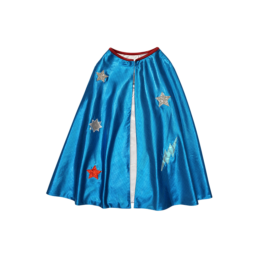 Детям очень нравится наряжаться супергероями и спасать мир. Этот замечательный костюм состоит из плаща с звёздами и молнией, оригинальной маски и нарукавников. Он хорошо дополнит любое трико и будет смотреться очень нарядно, благодаря блестящей ткани. Все декоративные элементы держатся очень крепко. Костюм подойдёт сразу на несколько размеров и на малыша любого телосложения.