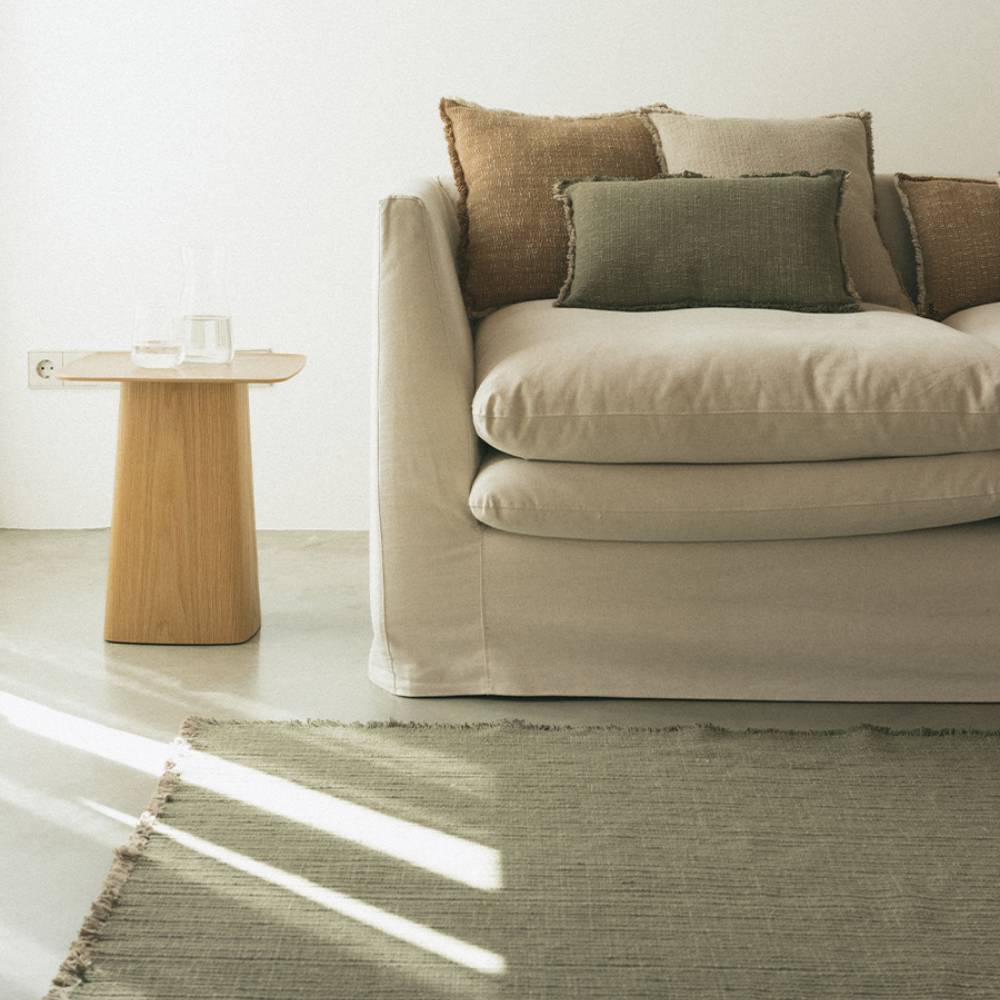 Хаки — универсальный цвет, которые выглядит дорого без лишних усилий. Этнический геометрический узор на таком фоне смотрится сдержанно и тепло, без лишней яркости. Ковёр из натурального хлопка, сделан вручную, хорошо вписывается в интерьеры с деревом, льном и другими природными материалами. Стирается в машинке — и это, пожалуй, главный аргумент для семей с детьми.