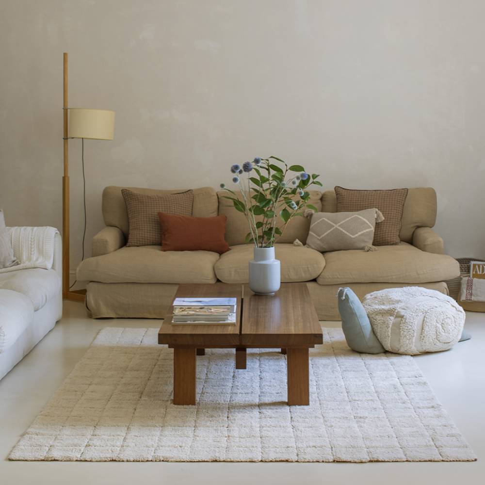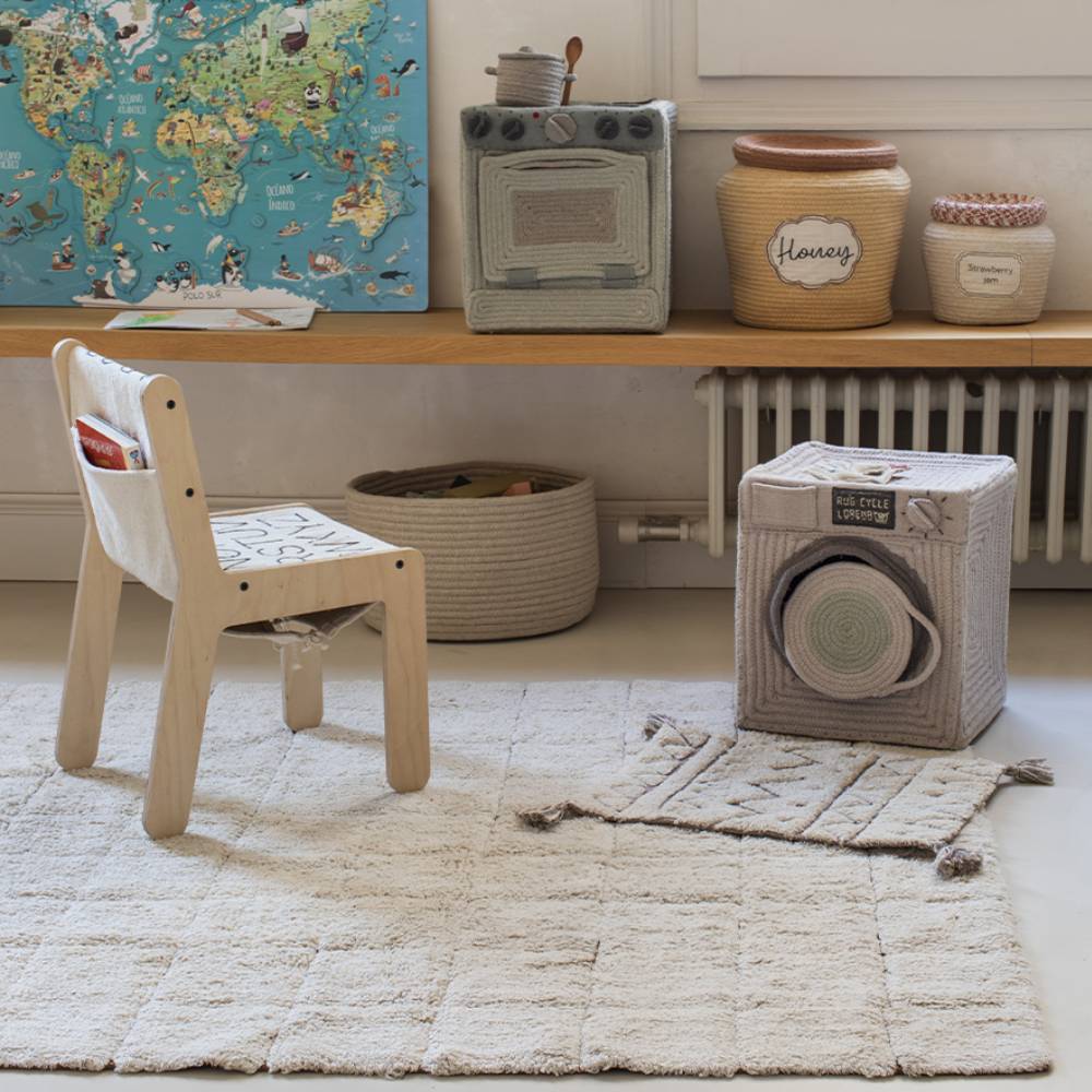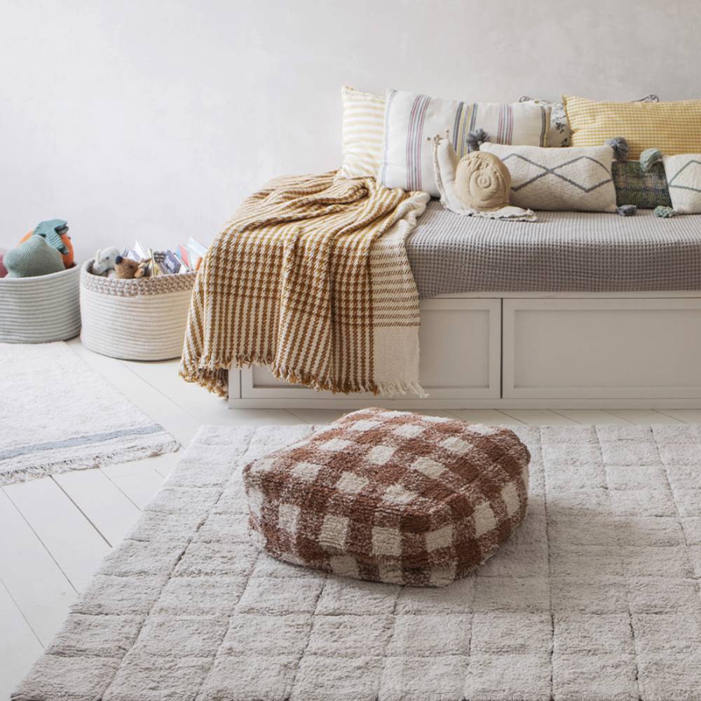 Винтажный рисунок под старую плитку в большом формате, который уже по-настоящему меняет ощущение комнаты. На таком ковре помещается и детский уголок, и обеденная зона, и просто место, где хочется сидеть на полу. Органический хлопок, натуральные красители — ковер сделан вручную и стирается в машинке. Подходит для любого стиля интерьера.