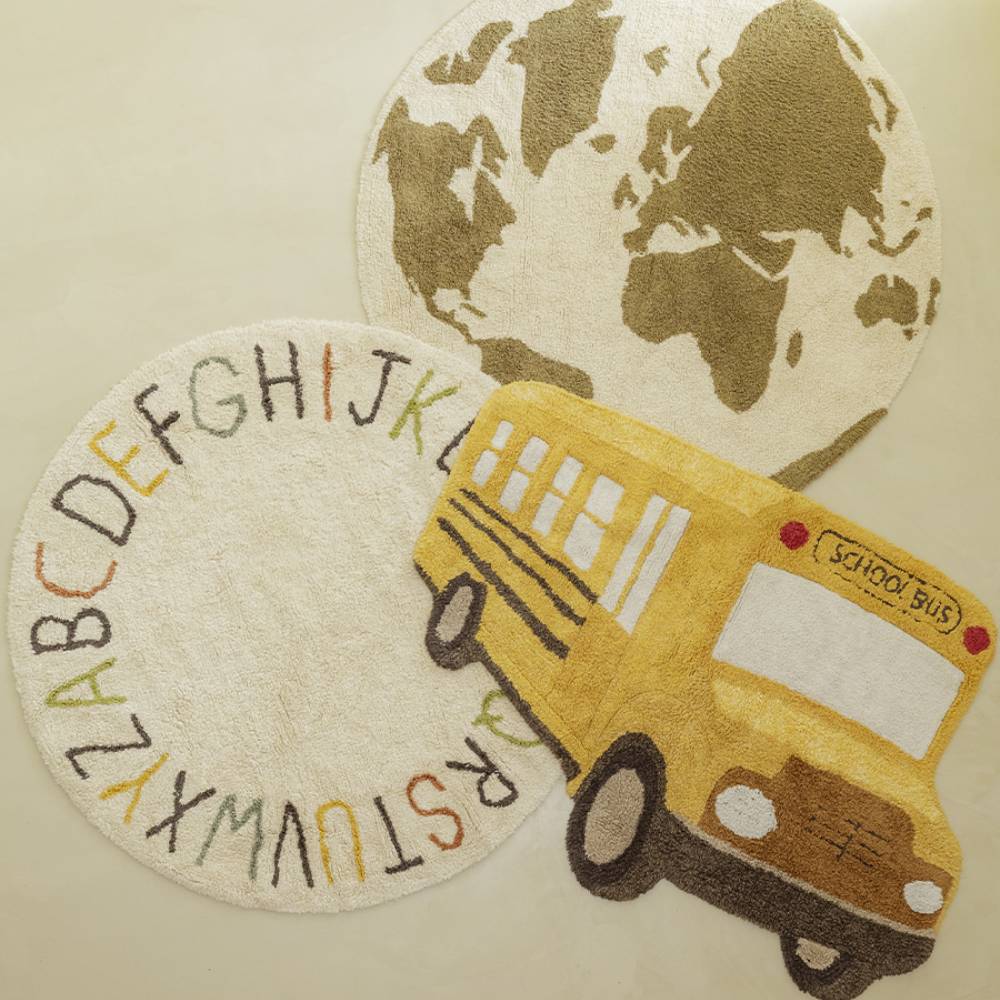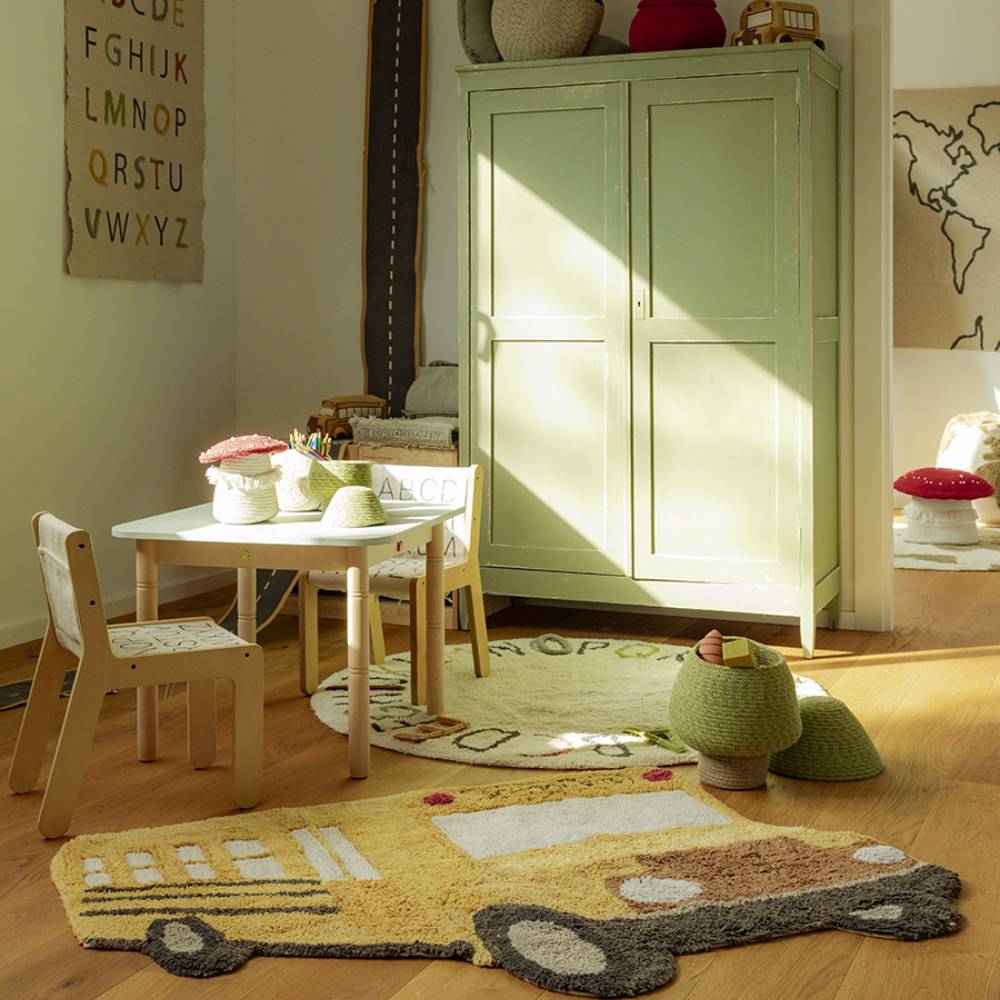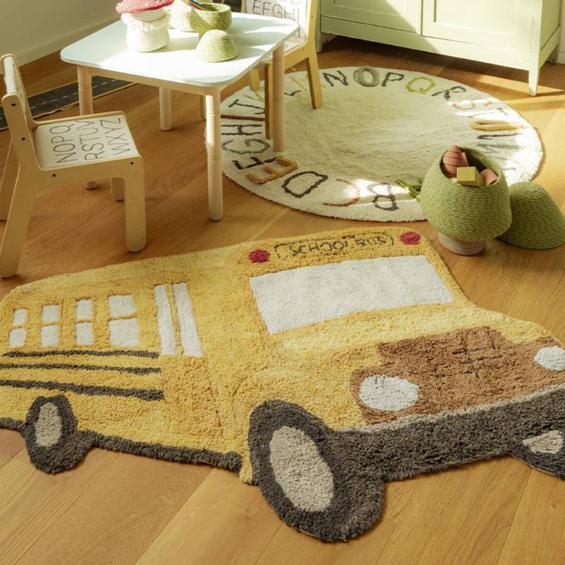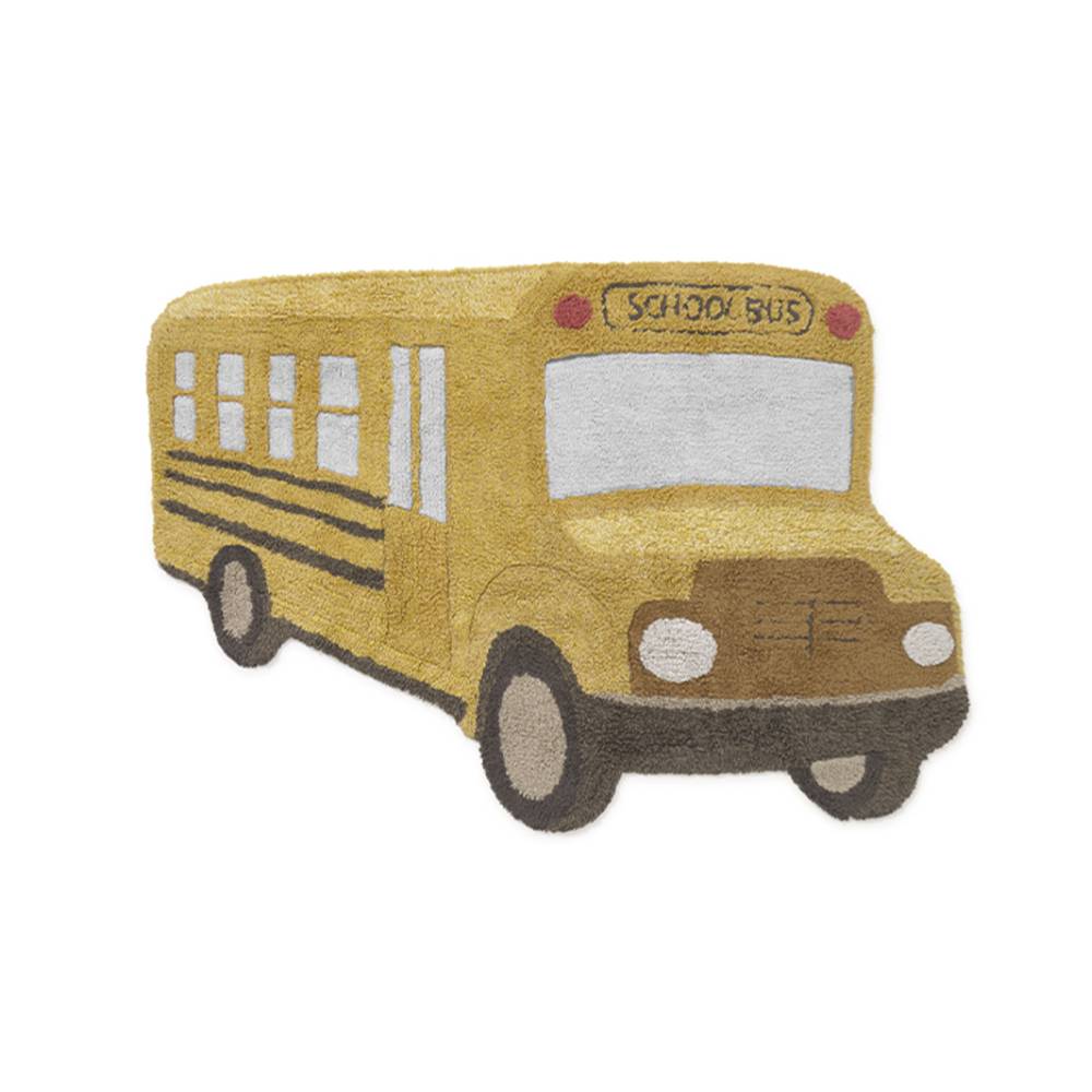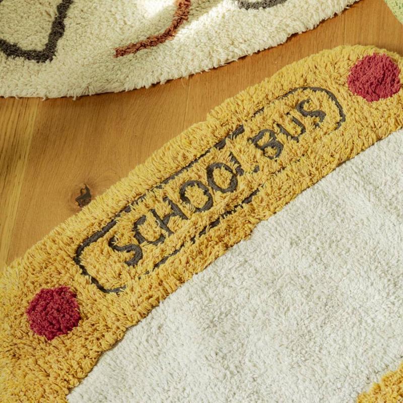 Ковёр в форме жёлтого школьного автобуса — фигурный, с вышитыми окнами, фарами и объёмными деталями, сделанными вручную. Он сразу становится любимым местом для игр: дети усаживают туда игрушки, придумывают маршруты и истории. Хлопок с натуральными красителями, стирается в машинке. Хорошо смотрится как на полу, так и на стене — как декор.