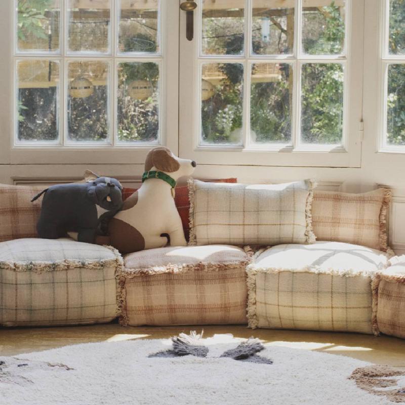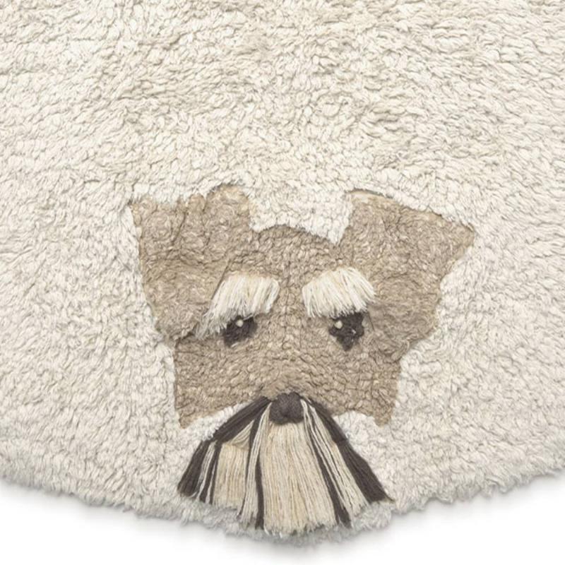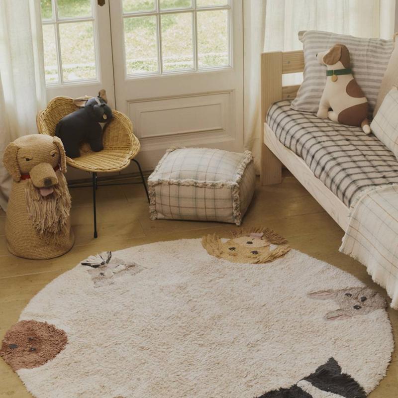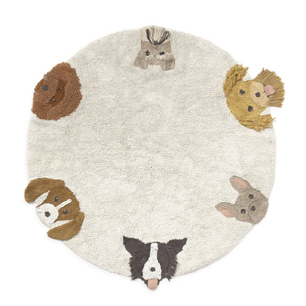 Круглый ковёр с шестью разными породами собак — каждая сделана вручную, со своими ушками, мордочкой и характером. Дети обычно сразу начинают их разглядывать и придумывать имена, так что ковёр быстро становится частью игры, а не просто лежит на полу. Хлопок, натуральные красители, стирка в машинке — всё как надо для детской комнаты.