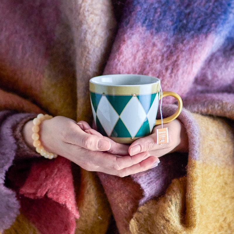 Праздничная геометрия на керамике. Зелёная кружка с напечатанным орнаментом и объёмными золотыми точками, которые создают тактильный эффект. Ручка покрыта золотой краской для контраста. Вмещает 300 мл — достаточно для полноценной порции глинтвейна или какао. Рождественский дизайн, который не выглядит слишком нарядным, чтобы использовать его только раз в году.