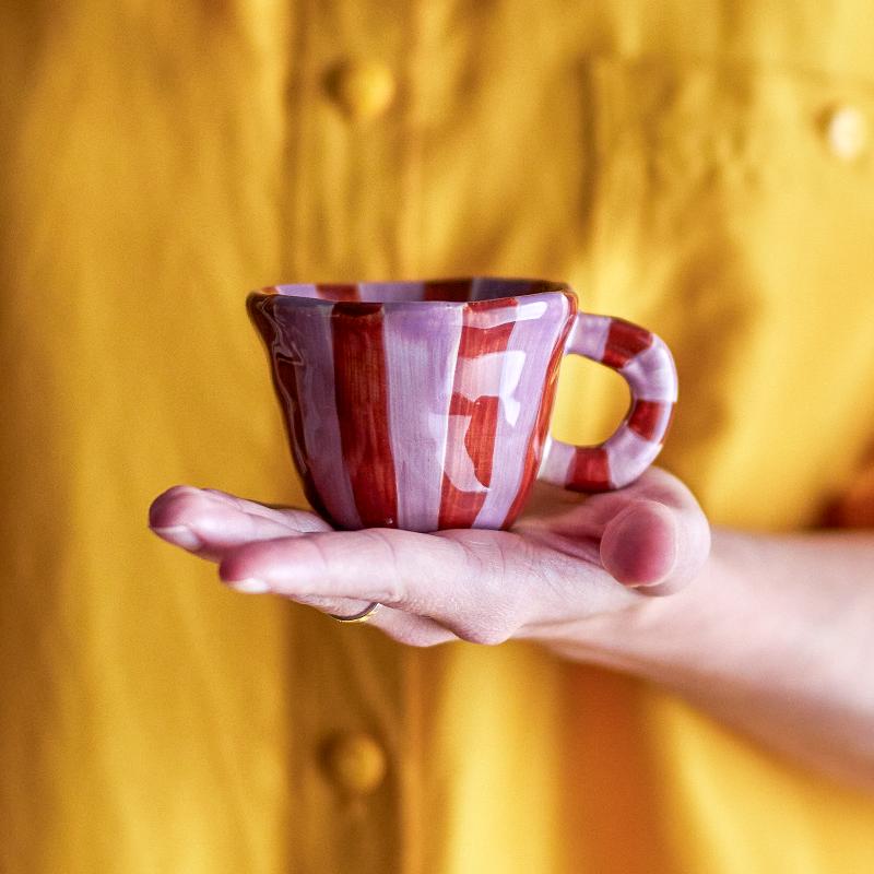 Крохотная кружка Nini объёмом 100 мл — для тех, кто пьёт эспрессо или просто любит миниатюрные вещи. Роспись в вишнёвых тонах с полосками и цветными деталями делает каждую кружку уникальной. Ручная работа заметна в каждом штрихе, и это подкупает. Отлично смотрится как самостоятельно, так и в компании других чашек Bloomingville — коллекция растёт сама собой, потому что остановиться сложно.