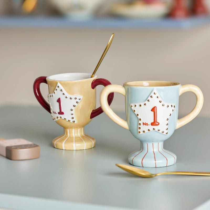 Два трофейных кубка для маленьких чемпионов завтрака. Голубая и жёлтая керамические кружки в форме наградных чаш превращают утренний ритуал в праздник. По 150 мл достаточно для сока или молока. Керамика приятная на ощупь и безопасная для детей. Можно использовать по очереди или устроить дружеское соревнование, кто первый допьёт. Датский дизайн с чувством юмора.