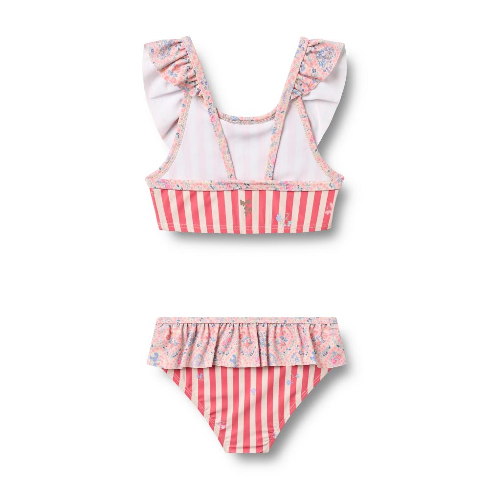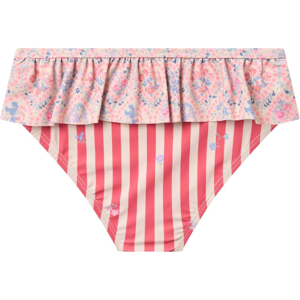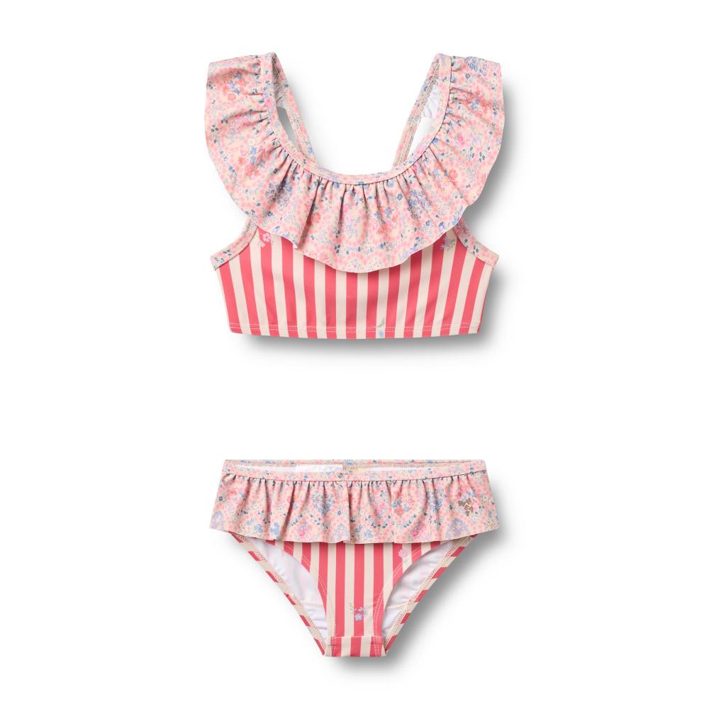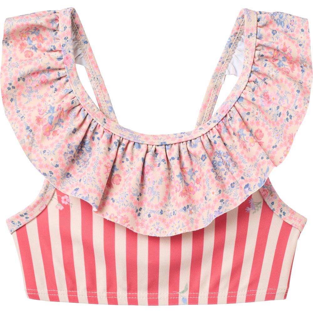 Раздельный купальник розового цвета с цветами-сердцами. Лиф на бретелях регулируется. Трусики с хорошей посадкой. Ткань быстро сохнет, тянется. Яркий романтичный принт. Для пляжа, бассейна, отдыха у воды. Устойчив к хлорке и соли. Эластичный, не сковывает при плавании. Легко ухаживать. Красивый летний купальник для девочек. Стильный скандинавский дизайн от бренда.