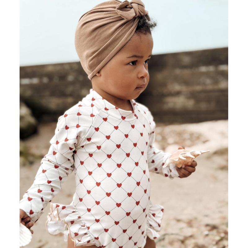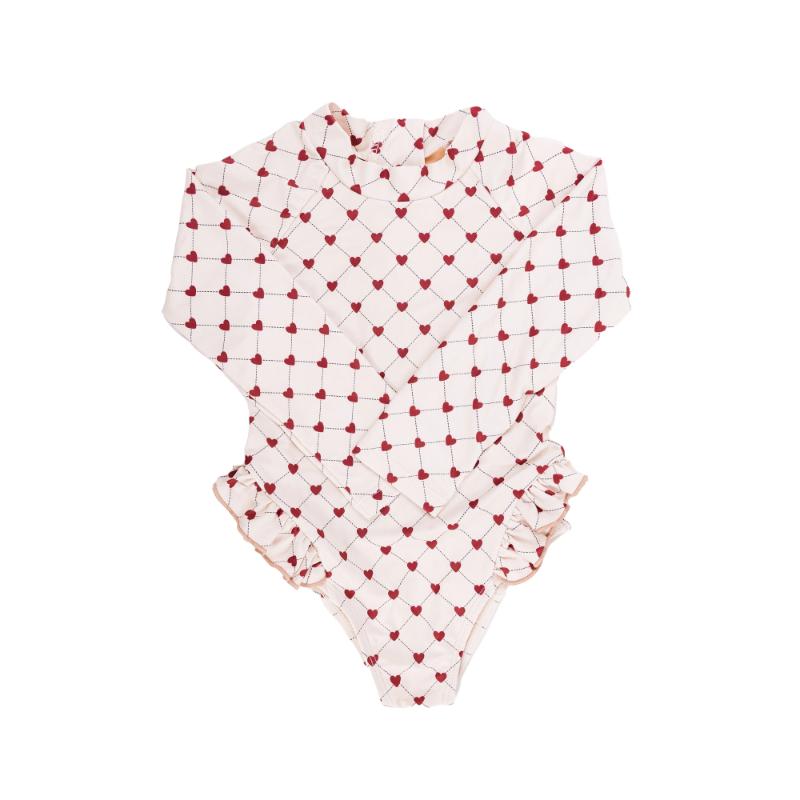 Закрытый купальник с длинными рукавами для максимальной защиты от солнца. Идеален для чувствительной детской кожи, которая быстро обгорает. Плотно облегает тело, не сковывает движений при плавании. Рукава надёжно держатся, не задираются в воде. Быстро сохнет после купания. Романтичный принт с сердечками понравится девочкам. Отличный выбор для долгих дней на пляже без переживаний об ожогах.