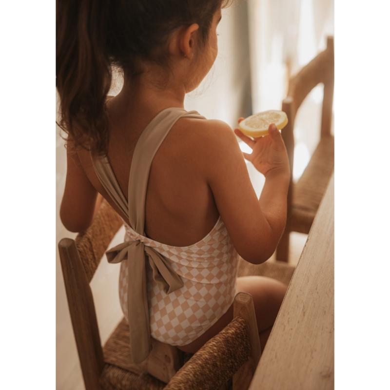 Удобный купальник с регулируемым бантом сзади для идеальной посадки. Подкладка делает носку комфортной, ничего не просвечивает. Отлично сидит на фигуре, повторяет изгибы тела без давления. Лямки надёжно фиксируются, не спадают во время купания. Нежный узор в ромбик смотрится элегантно и не надоедает. Практичный выбор для активного отдыха у воды всё лето.