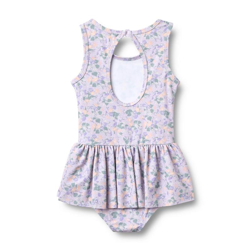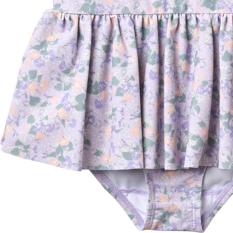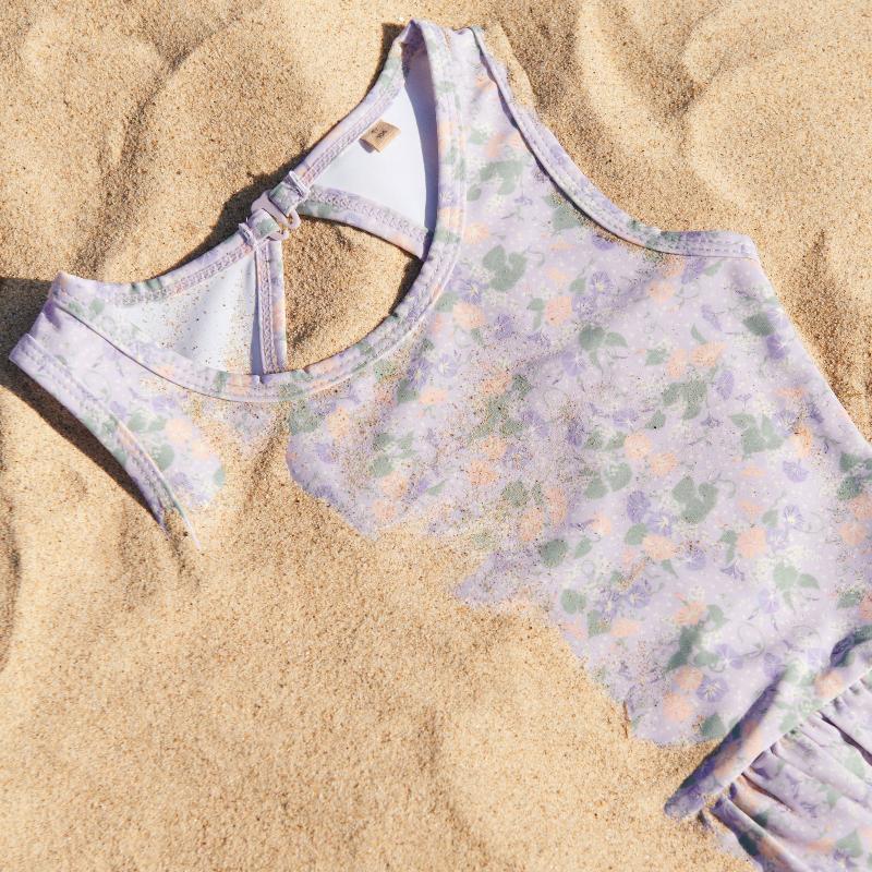 Слитный купальник с женственным кроем и изящными линиями, подчеркивающими талию. Главная фишка — маленькая юбочка, которая придает особую милоту и прикрывает бедра. Застежка-пуговица на спине делает переодевание легким даже на мокрого ребенка. Облегающая посадка обеспечивает комфорт при активных играх. Яркий принт с петуниями выглядит стильно. Ткань дышащая, защищает от солнца.