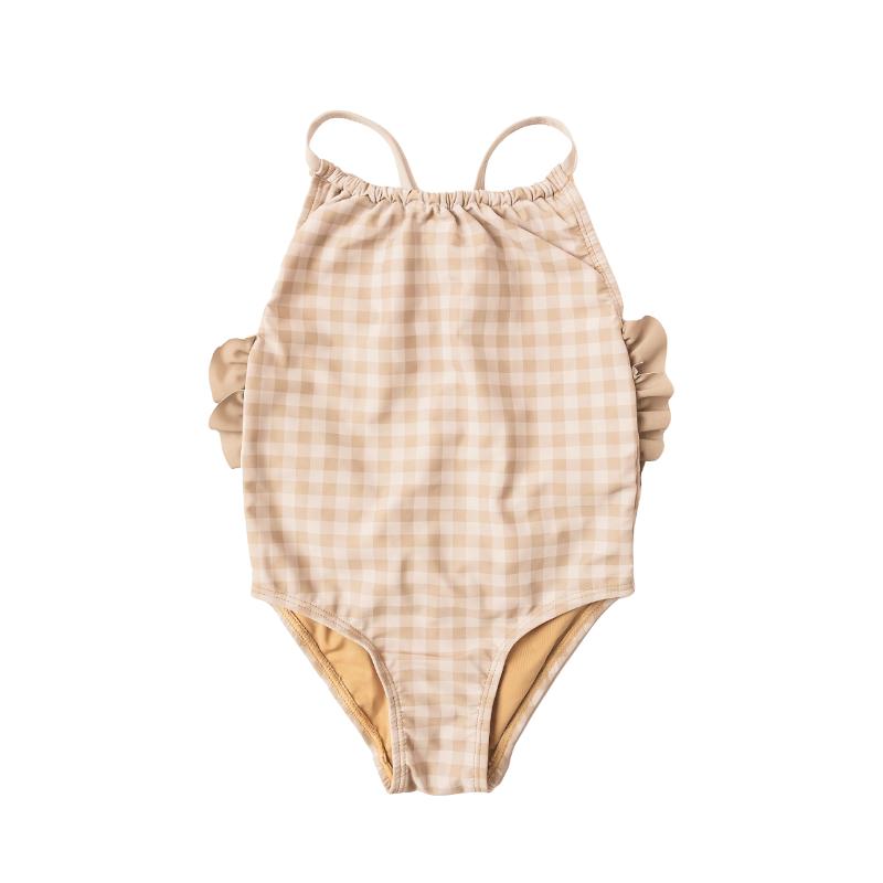 Стильный купальник с декоративными рюшами в нежных тонах. Воланы на плечах придают особую элегантность образу. Хорошо тянется, не сковывает движений в воде. Надёжно фиксируется на теле, ничего не съезжает. Подкладка добавляет комфорта в течение дня. Материал быстро сохнет. Мягкий узор в клетку виши смотрится изысканно. Практичный и красивый купальник для всего лета.