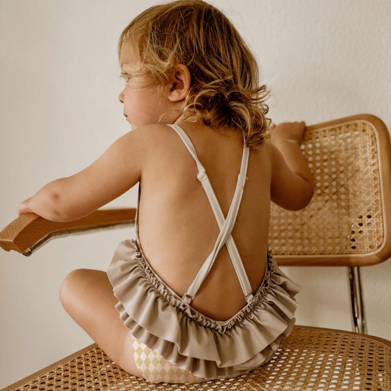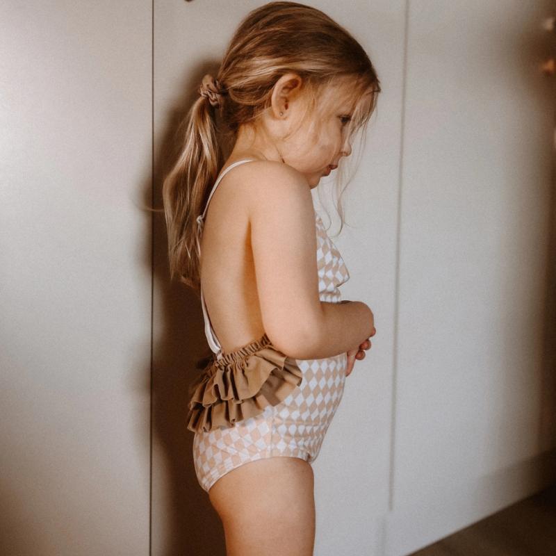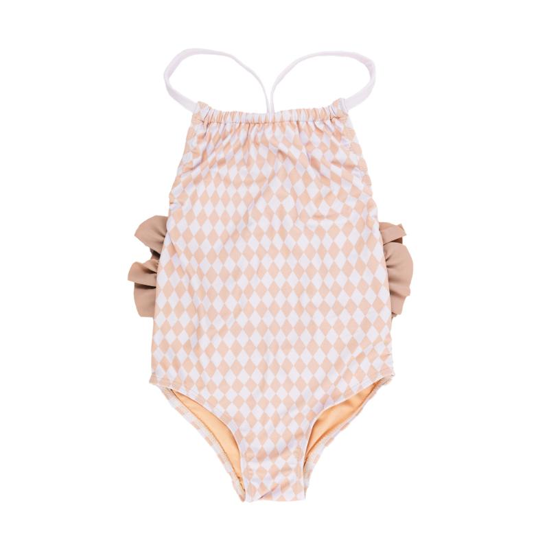 Купальник с элегантными рюшами для юных красавиц. Декоративные воланы на плечах создают романтичный силуэт. Отлично сидит на фигуре, повторяя изгибы без давления. Лямки не сползают даже при активных играх в воде. Подкладка обеспечивает комфорт в течение всего дня. Материал быстро сохнет. Нежный узор в ромбик выглядит изысканно. Идеальный купальник для пляжного отдыха и бассейна.