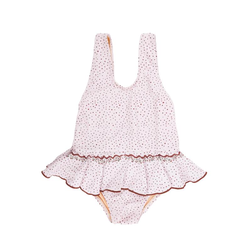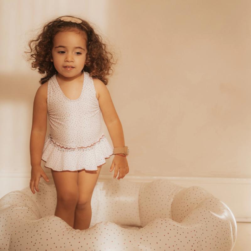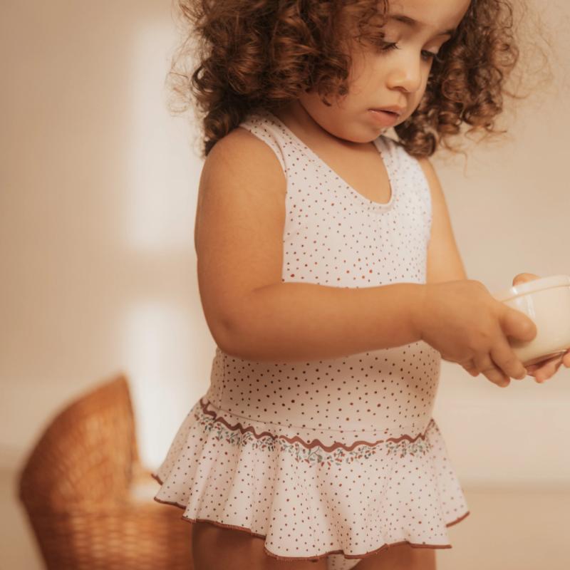 Купальник с юбочкой для комфортного отдыха у воды. Юбка создаёт более закрытый образ, что нравится многим родителям. Удобный крой позволяет свободно двигаться и плавать. Лямки надёжно держатся на плечах весь день. Подкладка обеспечивает комфорт. Быстросохнущая ткань удобна после купания. Весёлый принт в горошек поднимает настроение. Отличный выбор для пляжных каникул.