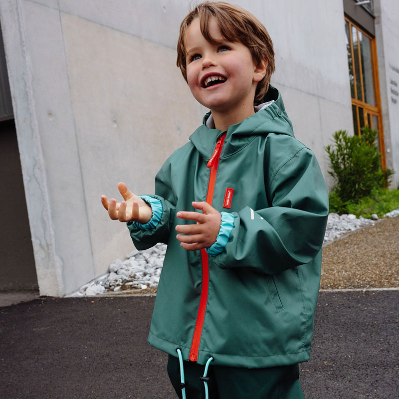 Тёмно-зелёный цвет сосны — практичный выбор для ежедневных прогулок. Водонепроницаемая ткань защищает от дождя и ветра. Удобная застёжка-молния легко открывается детскими руками. Капюшон при необходимости убирается в воротник. Карманы достаточно глубокие для телефона или игрушек. Куртка подходит для школы, прогулок и путешествий.