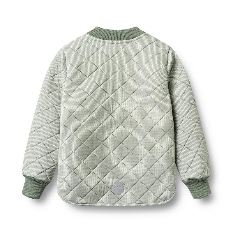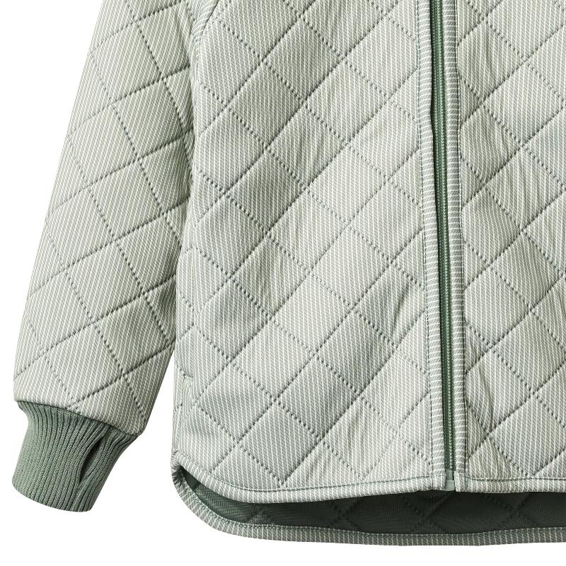 Стеганая куртка в зеленую полоску из переработанного полиэстера. Три слоя ткани сохраняют тепло. Отталкивает воду, но не полностью водонепроницаемая — для дождя лучше надеть сверху дождевик. Молния с защитой подбородка. Широкая резинка на воротнике и манжетах. Боковые карманы. Отражатель на спине. Легкая и мягкая, не мешает двигаться. Идеальна как промежуточный слой под куртку или как самостоятельная вещь в прохладный день. Для весны и осени.