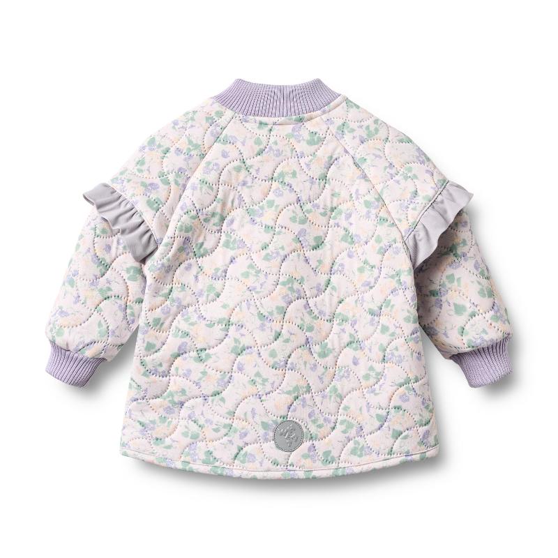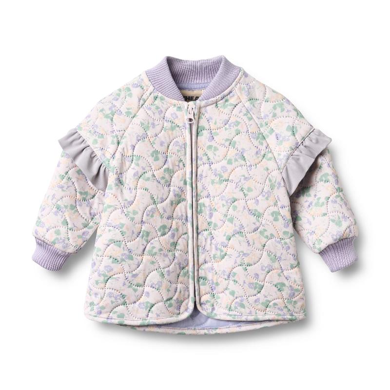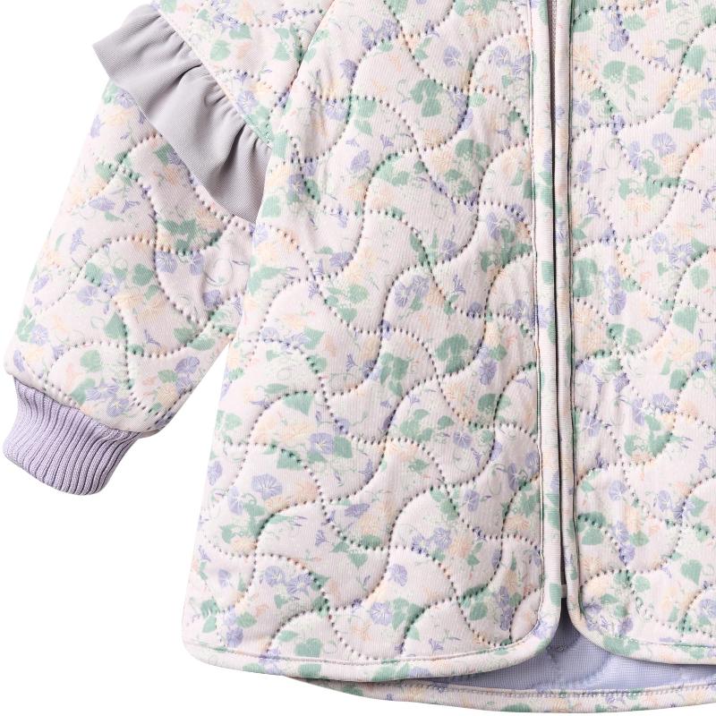 Фиолетовая термокуртка для девочек с крупными петуниями. Расклешенный крой от талии создает женственный силуэт. Стоячий воротник. Манжеты с прорезями для пальцев сохраняют тепло. Застежка-молния с защитой подбородка. Карманы по бокам. Отражающий значок повышает безопасность. Трехслойная стеганая конструкция греет и дышит. Водоотталкивающая поверхность защищает от брызг. В ливень дополняется дождевиком. Легкая, свободная для движений. Для прохладной весенней и осенней погоды.