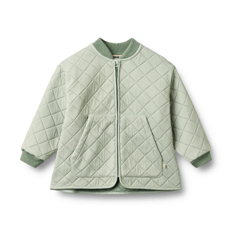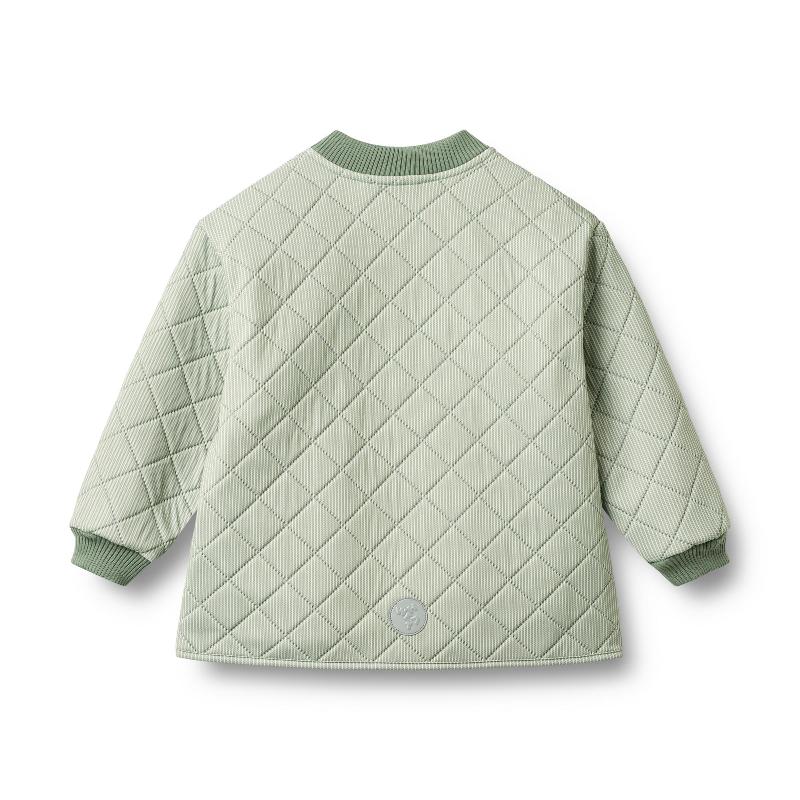 Стеганая куртка в зеленую полоску. Трехслойный утеплитель сохраняет тепло в прохладную погоду. Отталкивает воду, но не полностью непромокаемая. Молния с ветрозащитой внутри и защитой подбородка. Широкие резинки на шее и запястьях. Боковые карманы, светоотражатель на задней части. Легкая и удобная для движения. Сделана из переработанного полиэстера, экологичная. Подходит как верхняя одежда или слой под куртку. Для весны и осени.