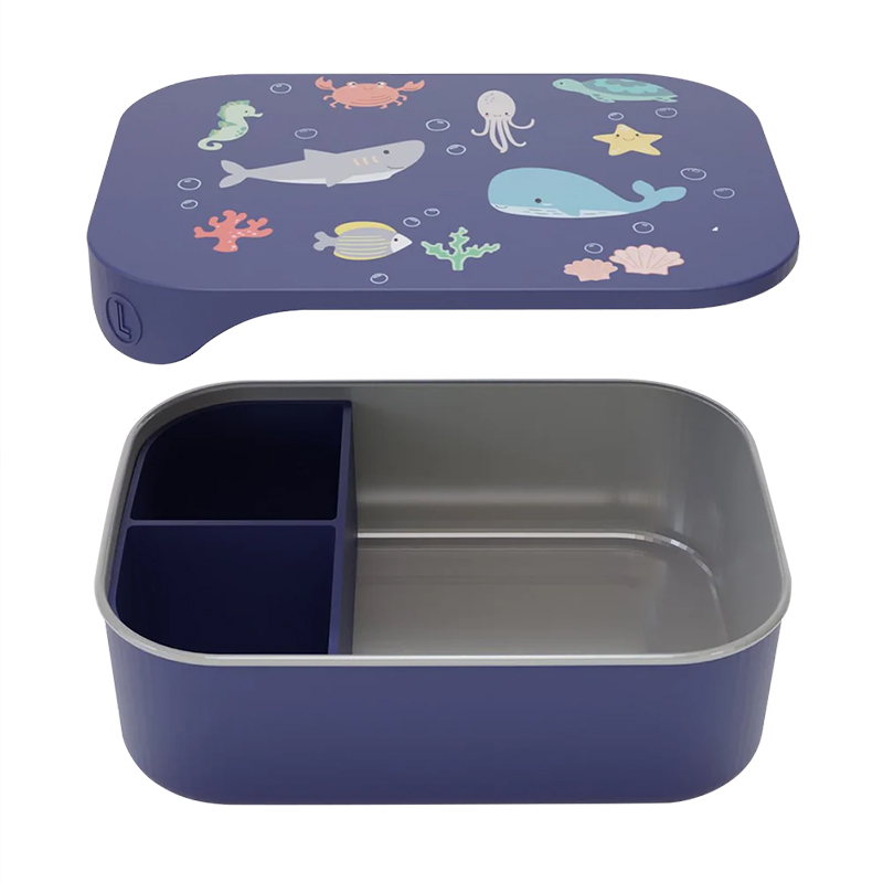 Яркий ланч-бокс с морскими обитателями — отличный выбор для детского обеда. Крышка из мягкого материала легко открывается детскими руками, но держится крепко в рюкзаке. Внутри есть съемная перегородка — можно разделить еду на три отсека или убрать и получить одно большое пространство. Металлическая основа легкая и прочная. Можно мыть в посудомойке, хранить в холодильнике и морозилке. Все детали снимаются для чистки. Компактный и удобный для маленьких рук.