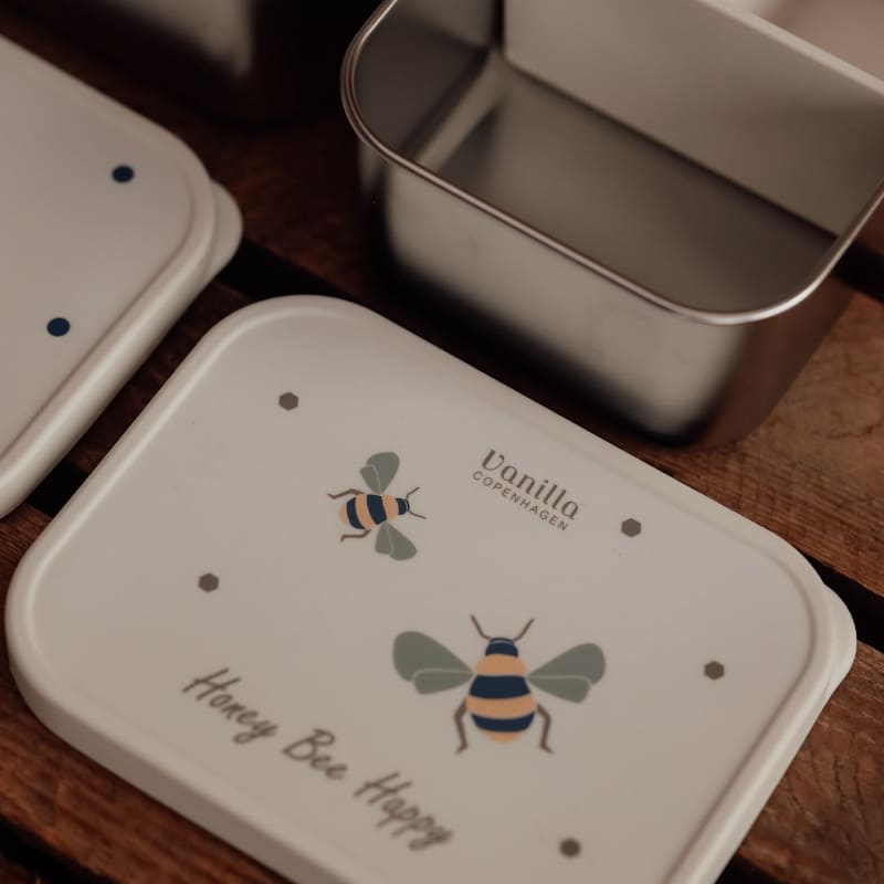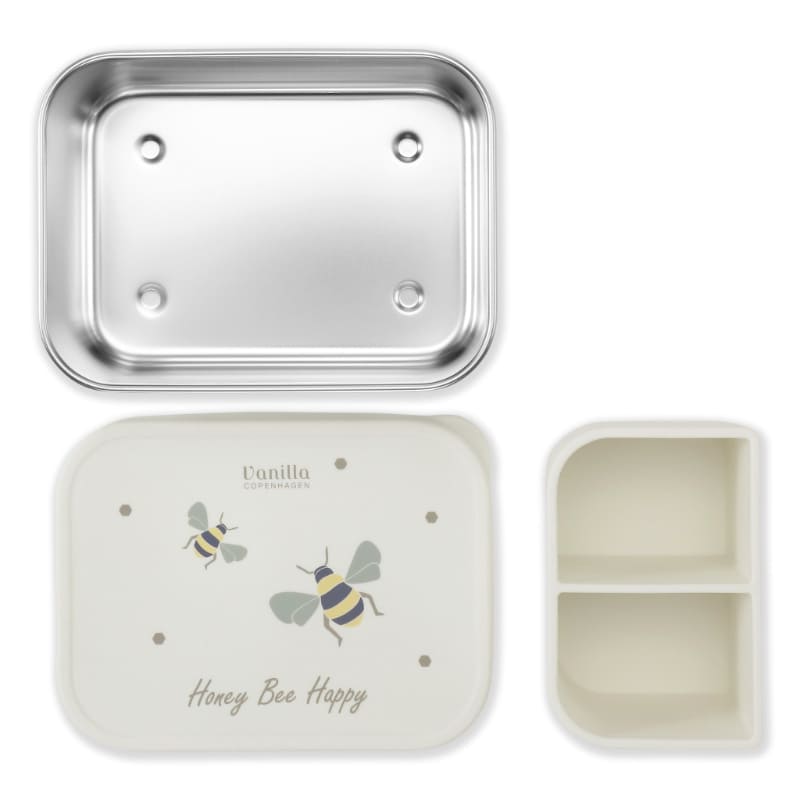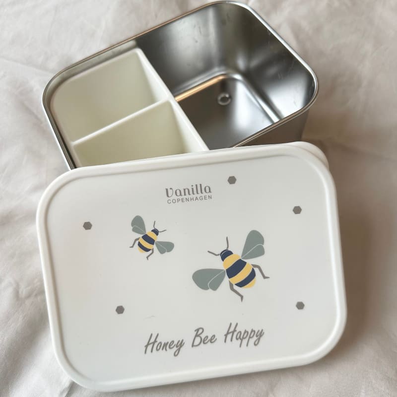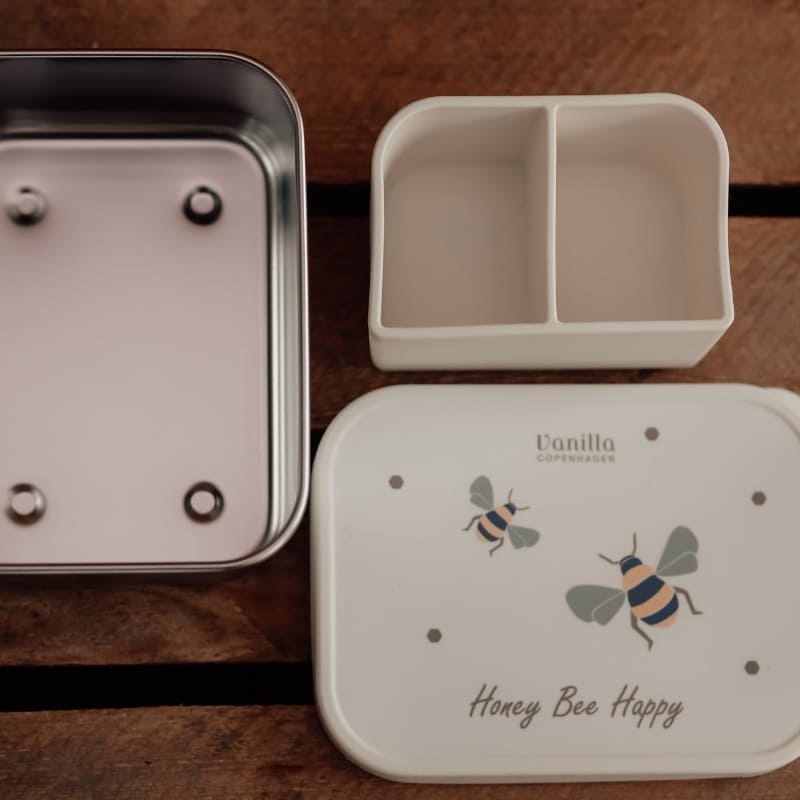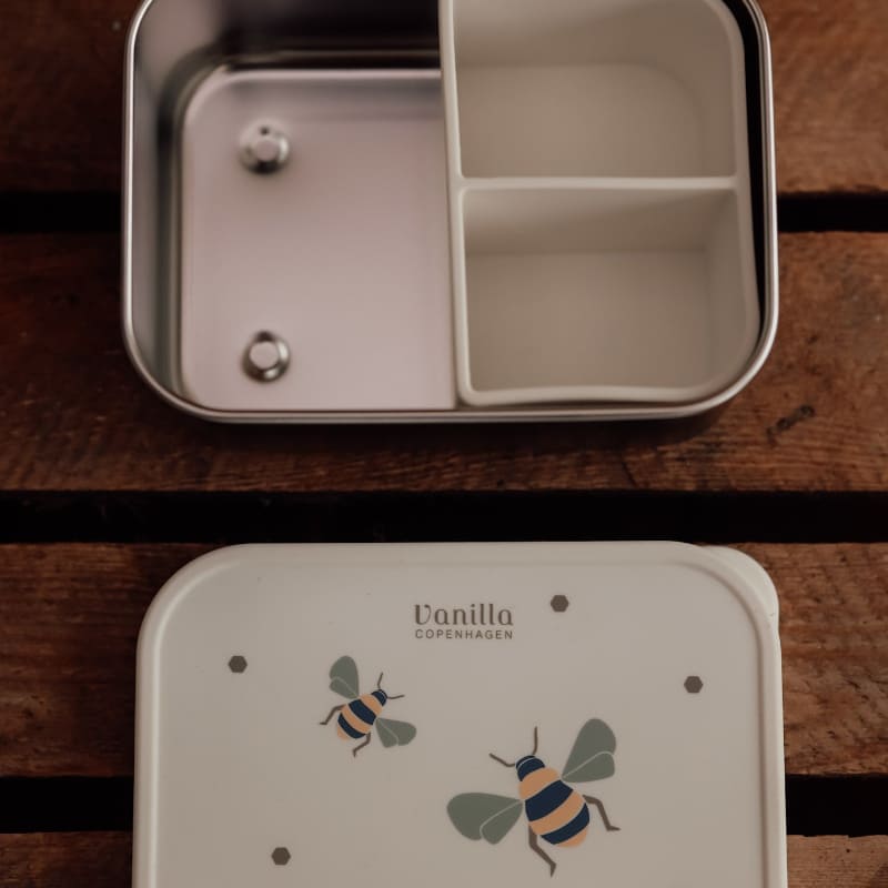 Ланч-бокс оформлен в мягком молочном цвете с очаровательным рисунком пчёлок. Внутри несколько отделений, позволяющих аккуратно распределить разные блюда и перекусы, сохраняя их свежесть и вкус. Компактный, но вместительный, отлично подходит для детских обедов в садике, на прогулке или поездке. Материалы безопасны и экологичны, легко моются и долговечны, а герметичная крышка предотвращает протекание.