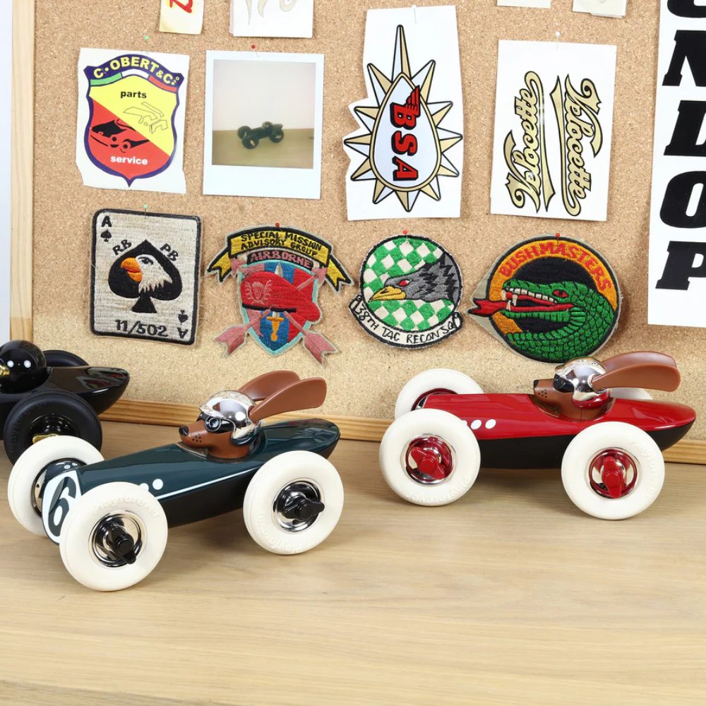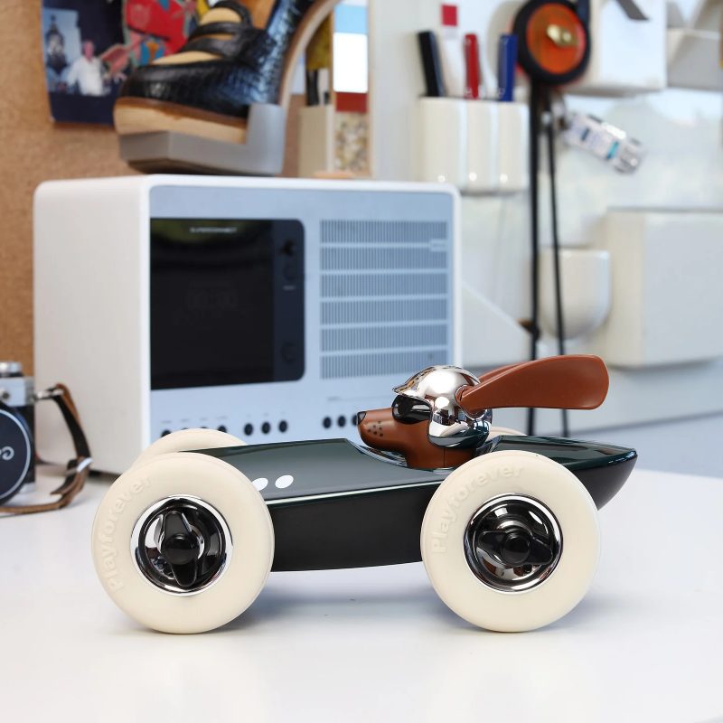 Зелёный Руфус Веллер – это воплощение скорости и элегантности! Пёс-гонщик в хромированном шлеме мчится на своём изумрудном болиде с белыми покрышками, а его длинные уши развеваются от скорости. Обтекаемые формы напоминают классические гоночные авто, а современное исполнение делает машинку практически неубиваемой. Яркий цвет не выгорает благодаря UV-покрытию, детали отполированы вручную. Руфус одинаково хорош и в динамичных гонках по ковру, и как стильный акцент интерьера детской. Грандиозное веселье гарантировано!