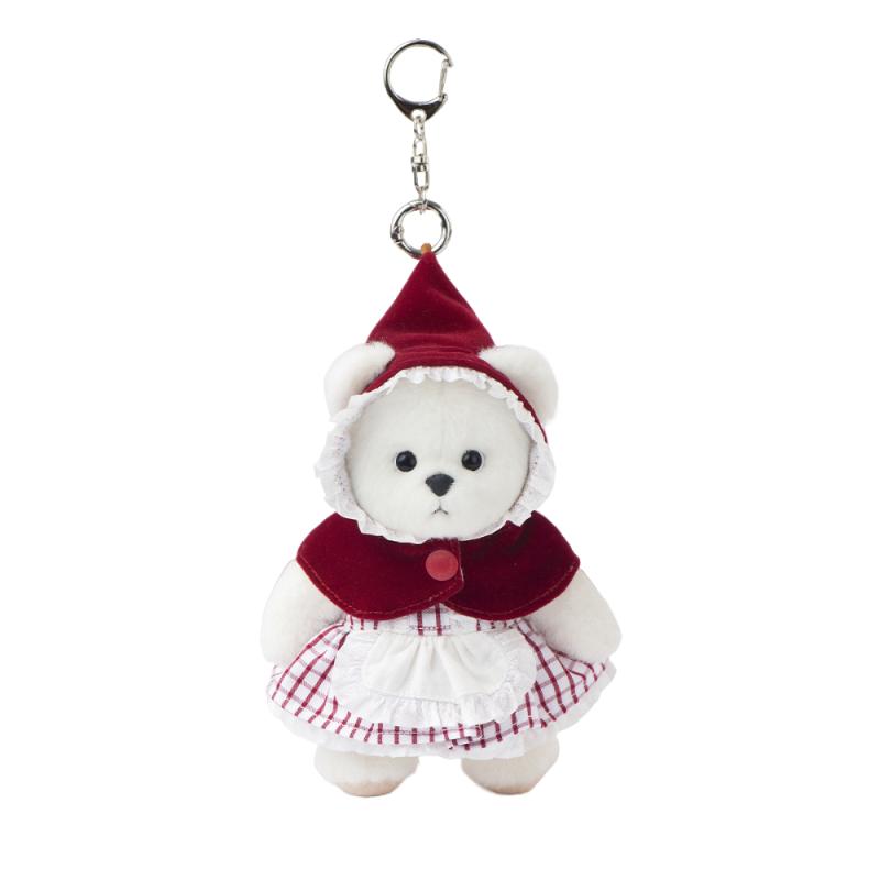 Белоснежный медвежонок примерил образ знаменитой героини сказки — красный капюшон и накидка превращают его в очаровательную Красную Шапочку. Костюм надёжно закреплён и не снимается, что важно для брелока. Яркий красный цвет создаёт контраст с белым мехом, делая аксессуар заметным. Компактный размер и металлический карабин позволяют носить мишку постоянно, добавляя сказочности в повседневность.