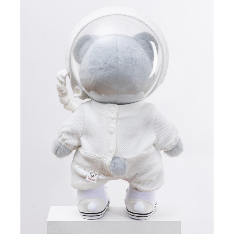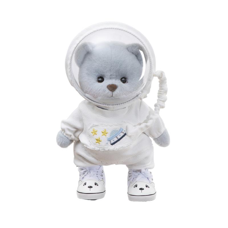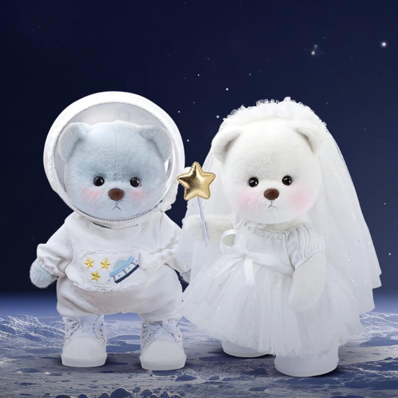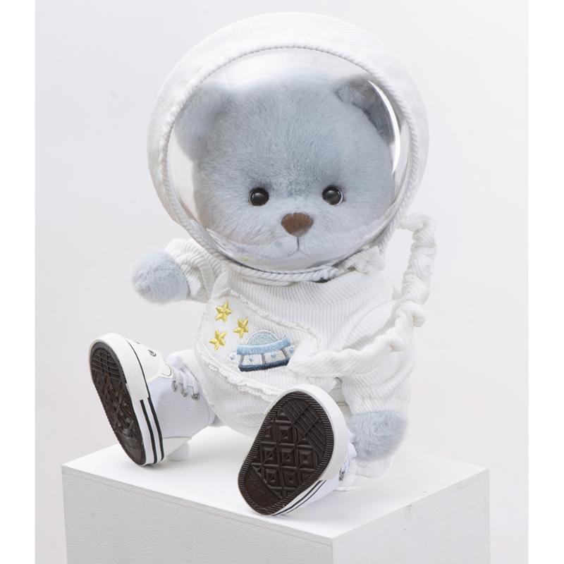 Космический жених в серо-голубом скафандре готов отправиться к звёздам вместе со своей возлюбленной. Костюм астронавта детально проработан: возможны имитация шлема, нашивки, характерные элементы. Серо-голубой оттенок самого медведя гармонирует с космической тематикой наряда. Это часть парной коллекции, которая рассказывает романтическую историю о любви, преодолевающей даже космические расстояния. Оригинальная идея для подарка паре или тематической фотосессии.