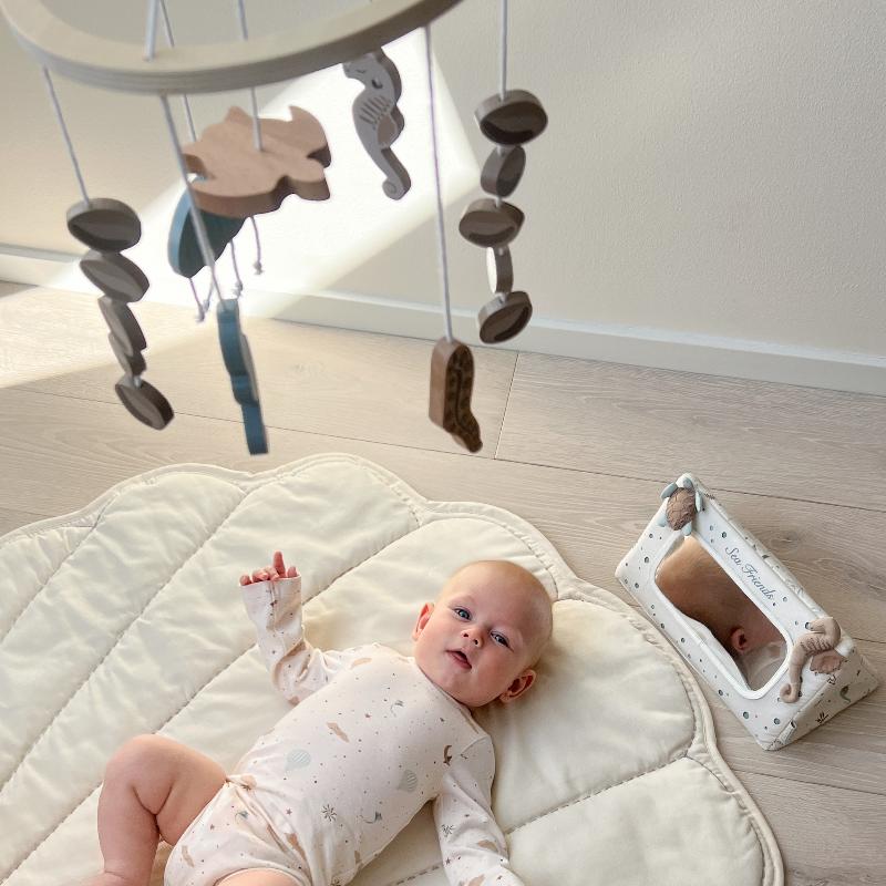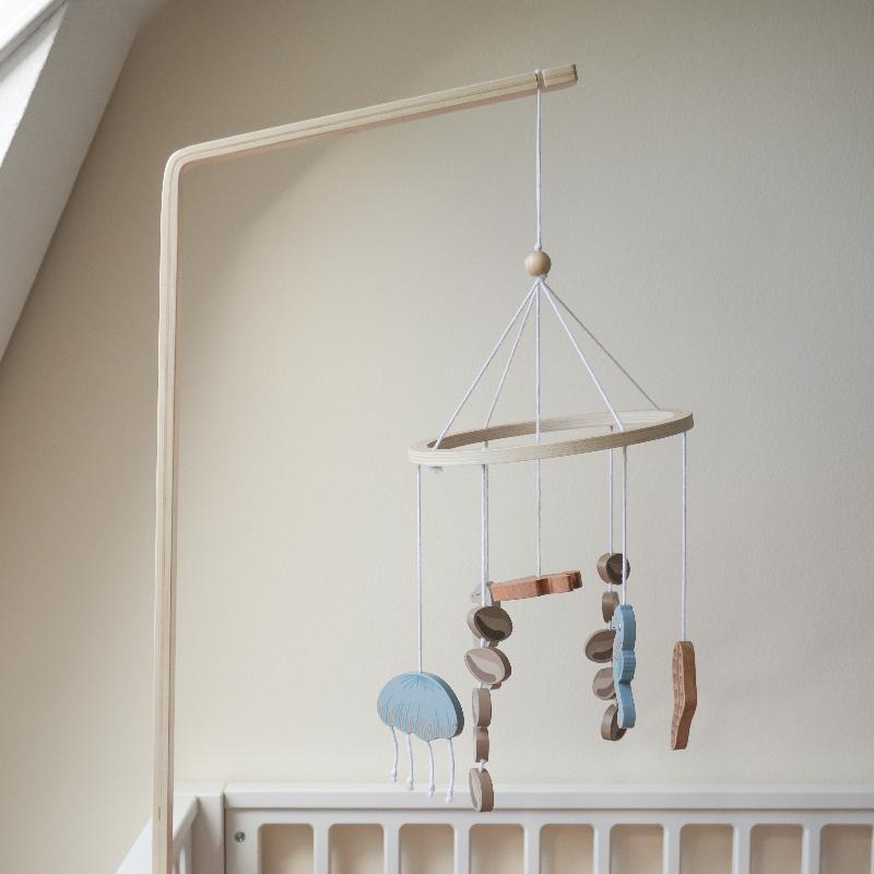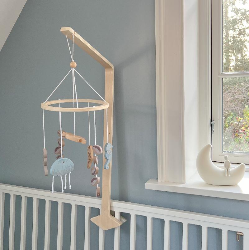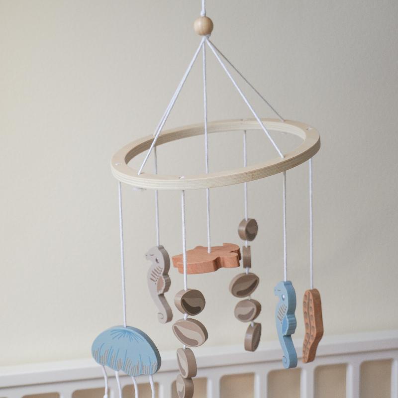 Морская тема в спокойной цветовой гамме. Подвесные элементы выполнены из мягкого текстиля, они медленно качаются и привлекают внимание малыша. Голубые и нейтральные оттенки создают умиротворяющую атмосферу над кроваткой. Мобиль крепится надёжно, конструкция продумана до мелочей. Это не просто развлечение для ребёнка, но и декоративный элемент, который вписывается в современный интерьер детской комнаты.
