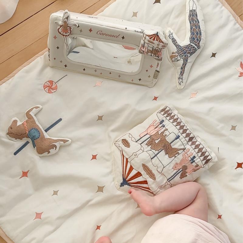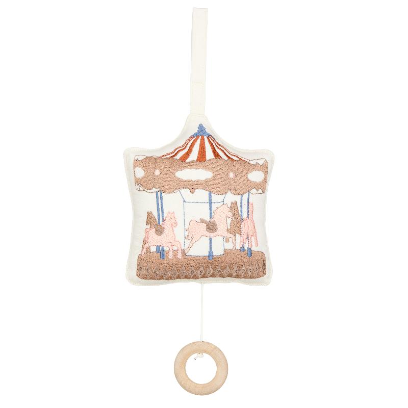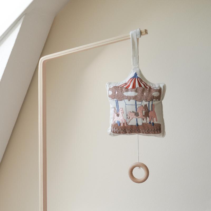 Карусельная конструкция с текстильными элементами медленно вращается под спокойную мелодию. Кремовая цветовая гамма не перегружает визуальное восприятие малыша. Музыкальный механизм проигрывает нежную колыбельную, которая помогает настроиться на сон. Крепление надёжное, все детали выполнены из безопасных материалов. Мобиль становится частью вечернего ритуала и создаёт атмосферу покоя над кроваткой. Функциональная красота по-скандинавски.