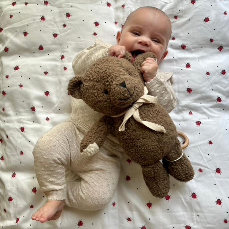 Уютный мобиль с плюшевым медвежонком коричневого цвета. Тяните за деревянное кольцо — зазвучит успокаивающая колыбельная, под которую так хорошо засыпать. Малыш следит глазками за игрушкой, тянется к ней, развивая координацию движений. Медвежонок снимается, можно постирать или дать ребенку поиграть. Изготовлен из органического хлопка с переработанным наполнителем. Подходит с первых дней.