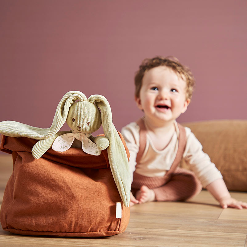 Жизнерадостный оливковый кролик-марионетка из коллекции Lapinoo с невероятно длинными ушами, за которые его можно подвесить где угодно, чтобы никогда не потерять. С ними он может делать всё: стоять на голове, качаться на качелях, висеть на веревке для белья и даже раскачиваться до самой луны. Благодаря длинным ушкам кролик окутывает малыша нежными объятиями и разделяет с ним сладкие моменты. Выполнен из мягкого вельвета с текстурированной поверхностью, которая дарит множество тактильных ощущений. Шарфик с природным принтом, вдохновленным средой обитания Lapinoo, гармонирует с цветом тела. Подвижные ручки и ножки легко захватываются маленькими пальчиками. Представлен в красивой подарочной коробке с персонализируемым вкладышем. Подходит с рождения.