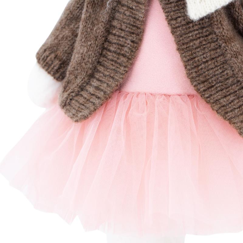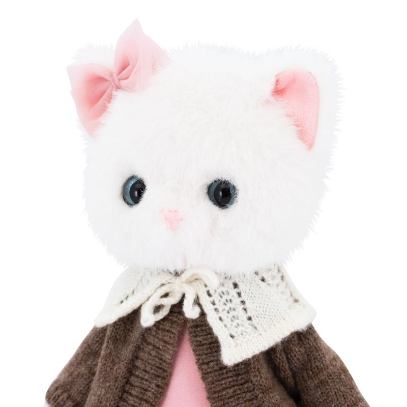 Кошечка выполнена в нежных светлых оттенках и дополнена аккуратным нарядом с декоративными деталями. Выразительные глазки и мягкая форма создают трогательный образ. Одежда продумана до мелочей и гармонично завершает внешний вид. С такой игрушкой легко придумывать добрые истории, брать её с собой на прогулку или устраивать спокойные домашние игры.