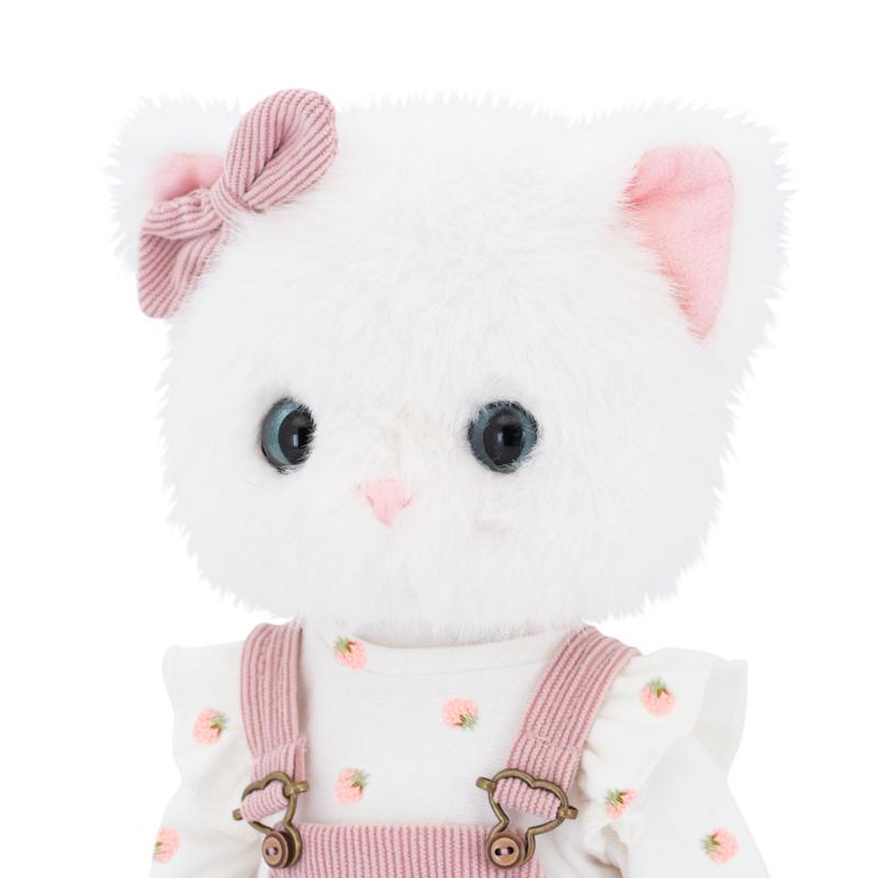 Мягкая кошечка с выразительными глазками и аккуратной вышивкой на мордочке выглядит по-домашнему тепло и спокойно. На ней продуманный наряд в пастельных оттенках, который создаёт атмосферу тихого вечера. Одежда аккуратно сидит, все детали гармонично сочетаются между собой. Игрушку удобно держать в руках, укладывать рядом перед сном и использовать в спокойных сюжетных играх.