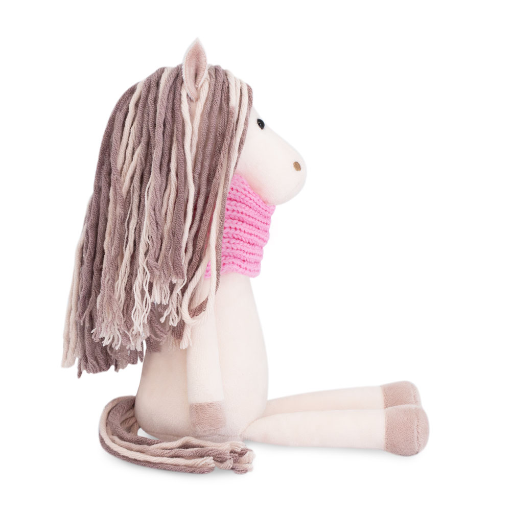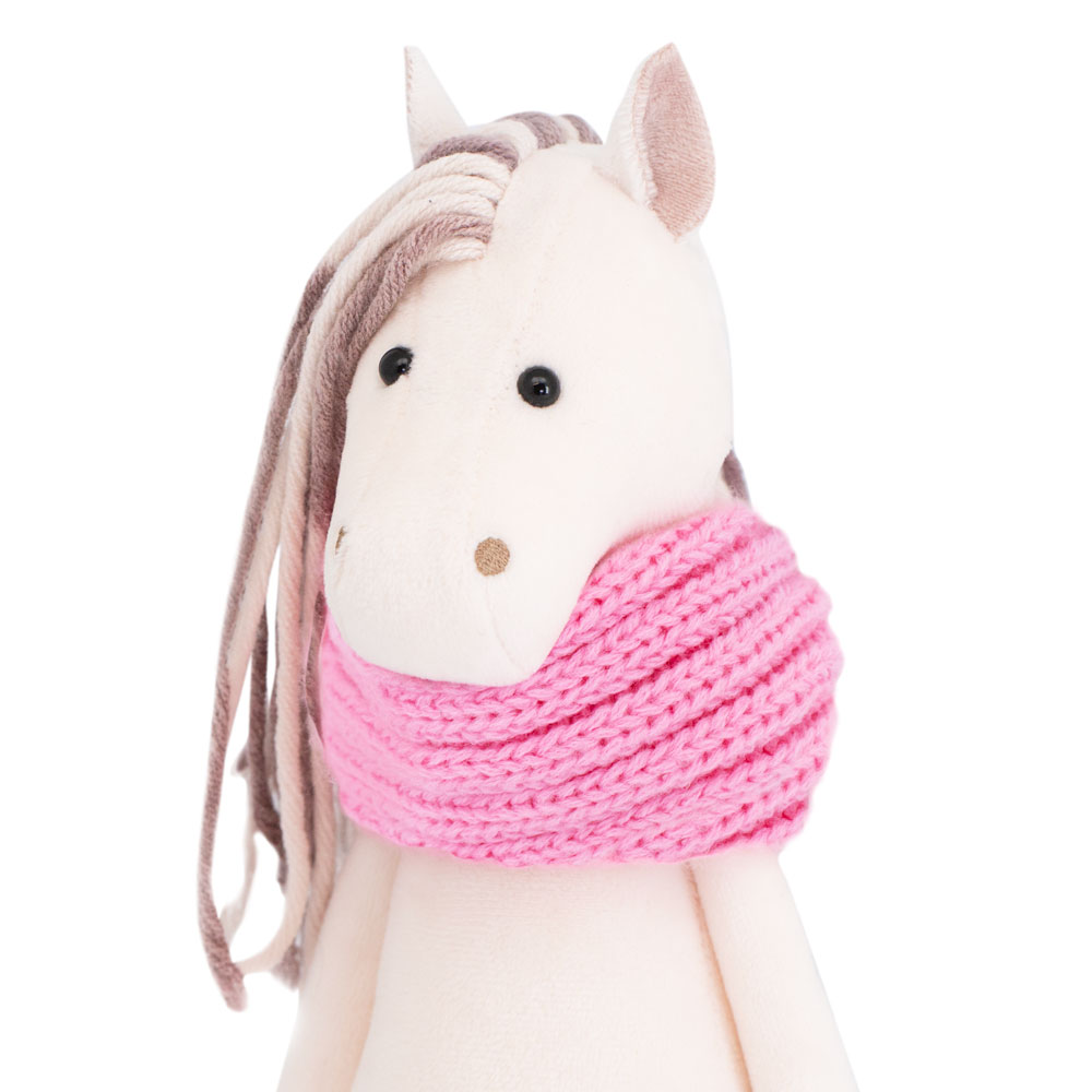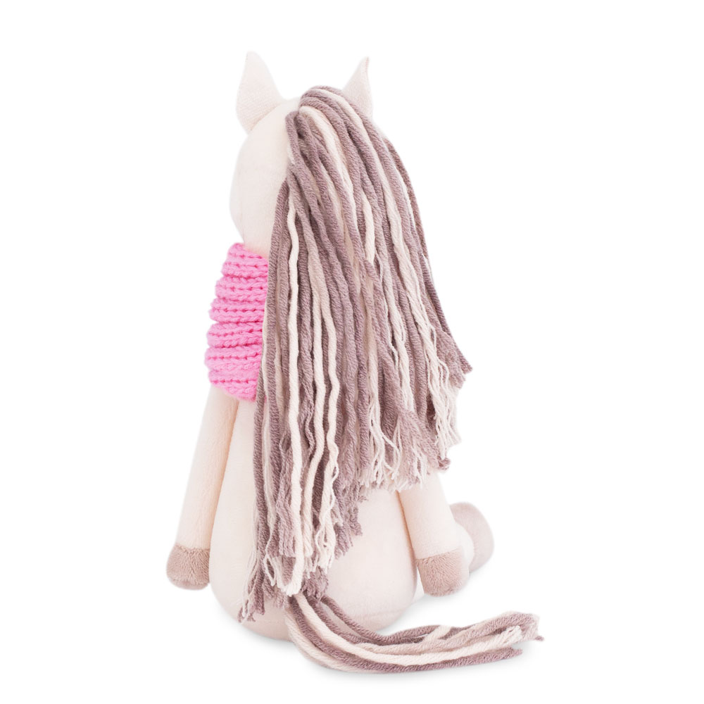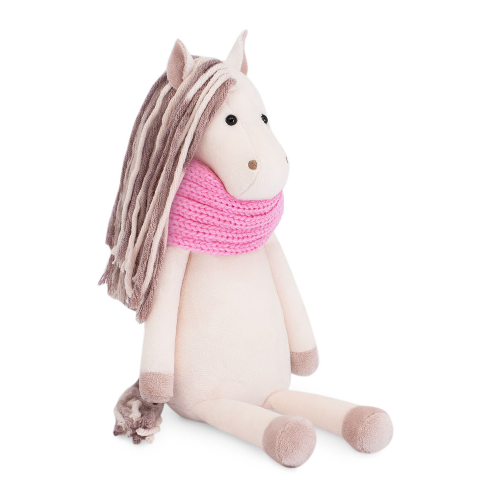 Бонни — мягкая игрушка с нежным и утончённым образом. Светлая шерстка, аккуратная грива и розовый вязаный шарфик делают её особенно милой. Она выполнена из гипоаллергенных материалов и подходит детям от 3 лет. Бонни будет замечательным подарком для девочек и девушек, украсит комнату или праздничный интерьер. В год Лошади 2026 она станет символом гармонии, вдохновения и удачи.