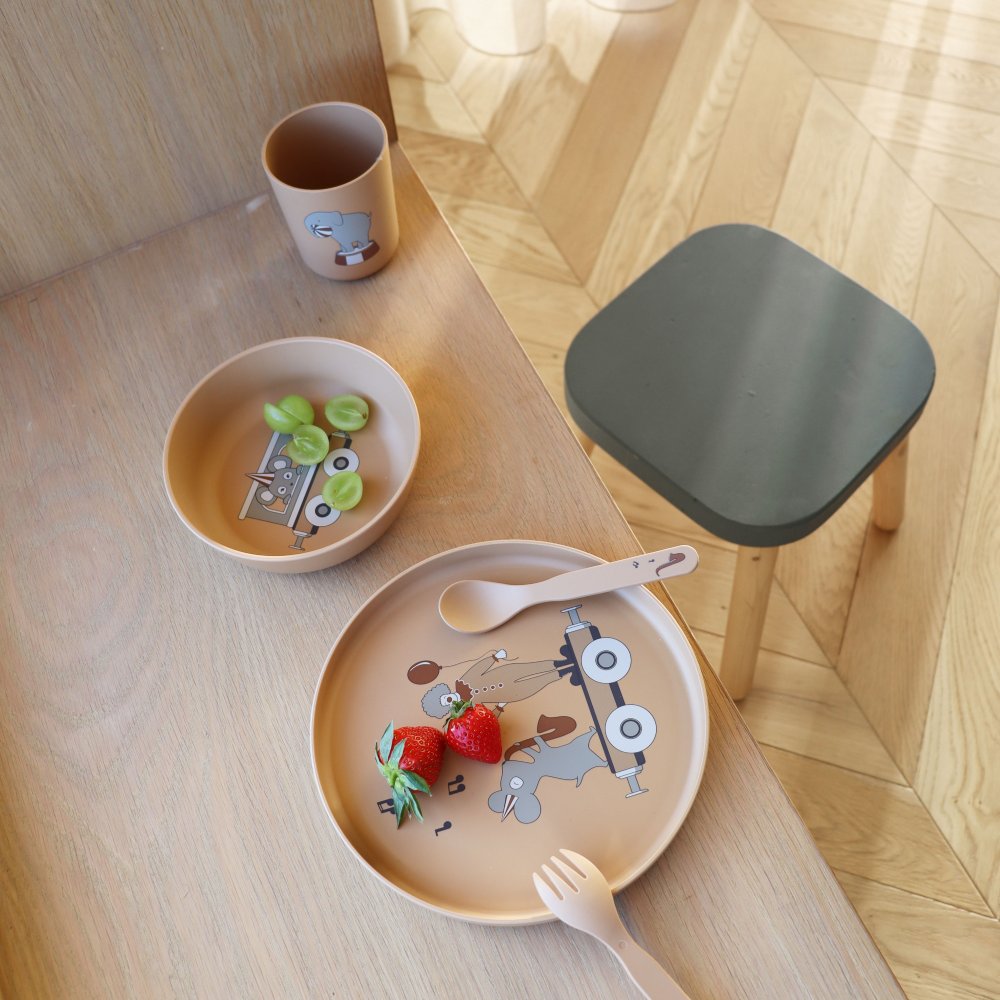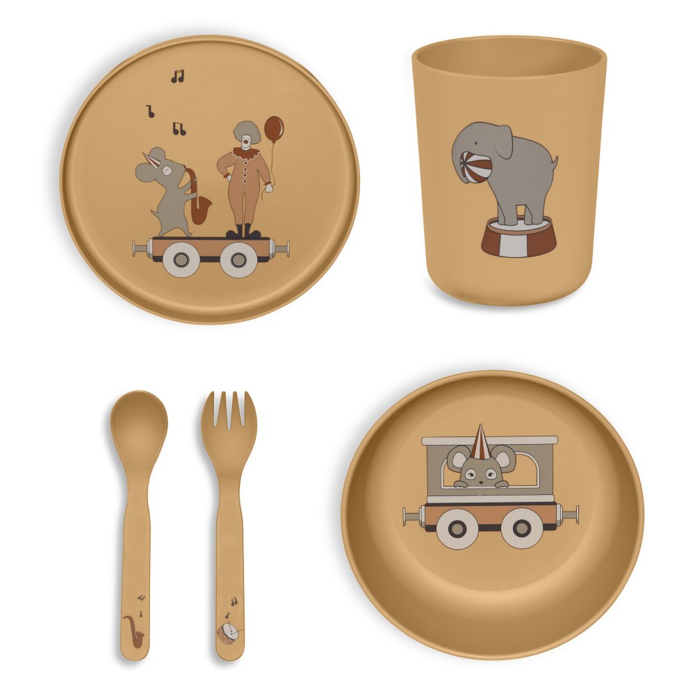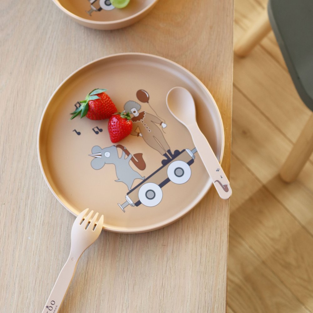Набор посуды Nuuroo оттенка кофе со льдом декорирован забавным принтом на тему веселой жизни цирковых артистов. Он точно понравится вашему малышу и поможет ему съесть обед до последнего кусочка. Выполненная из пластика высокого качества, эта посуда прочная, долговечная, не впитывает запахов пищи и безопасная для здоровья. В набор входит глубокая мисочка для жидких блюд и салатов, мелкая тарелочка, ложка и вилка и высокий бокальчик. Они легко отмываются, в том числе в посудомоечной машине и разрешены для использования в микроволновой печи.