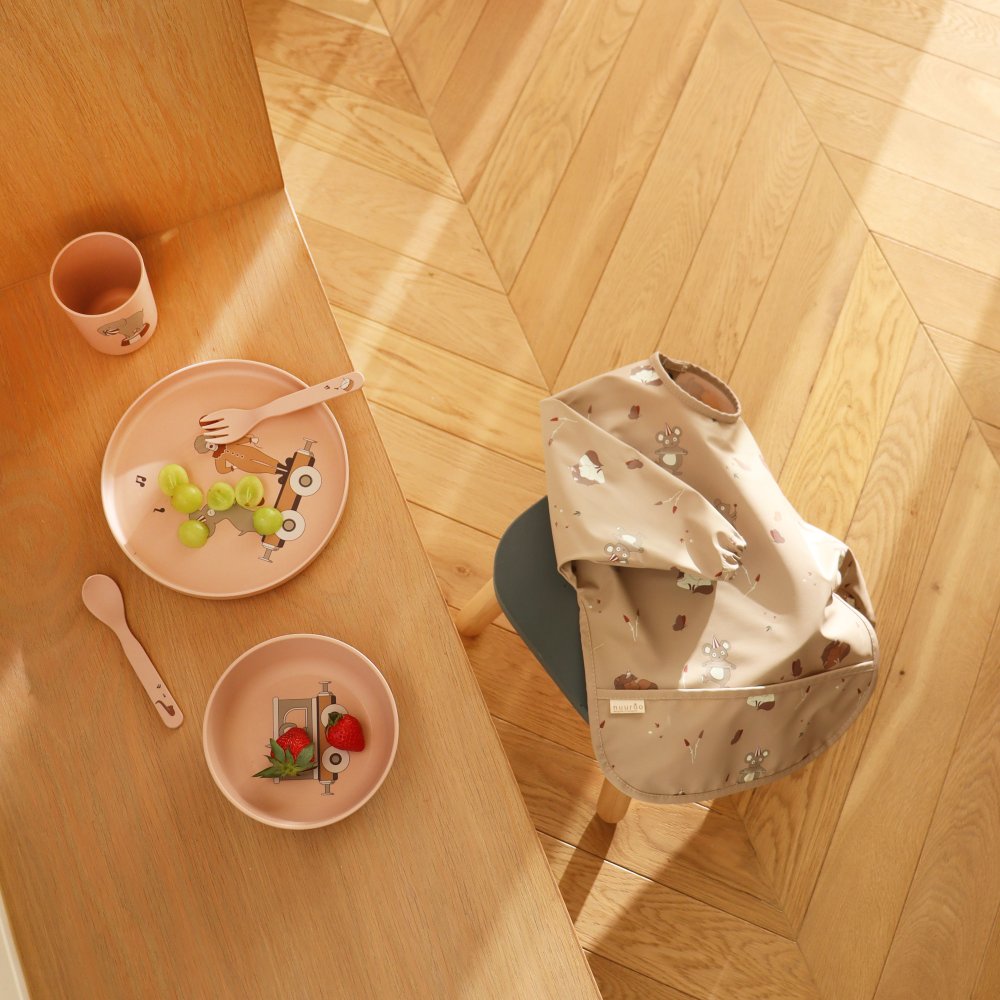 Симпатичный набор Nuuroo красивого пыльно-розового оттенка с весёлым и ярким принтом создан специально для малышей. Благодаря этой очаровательной посуде кроха будет съедать свой обед до последнего кусочка. Мисочка для жидких блюд и салатов, высокий бокальчик, мелкая тарелочка, а также вилка и ложка с эргономичными ручками выполнены из нетоксичного и прочного пластика PLA, разрешённого для контакта с пищевыми продуктами. Они без труда отмываются вручную и в посудомоечной машине и подходят для использования в микроволновой печи.
