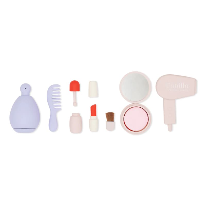 Дополнительная информация: изготовлен из сертифицированного FDA силикона, не содержит бисфенол-а, фталаты. Набор состоит из фена, расчески, лака для ногтей, помады, теней для век, парфюма, пудры с кисточкой и зеркала. Внимание: проверяйте изделие перед каждым использованием. При обнаружении повреждений, избегайте использования.