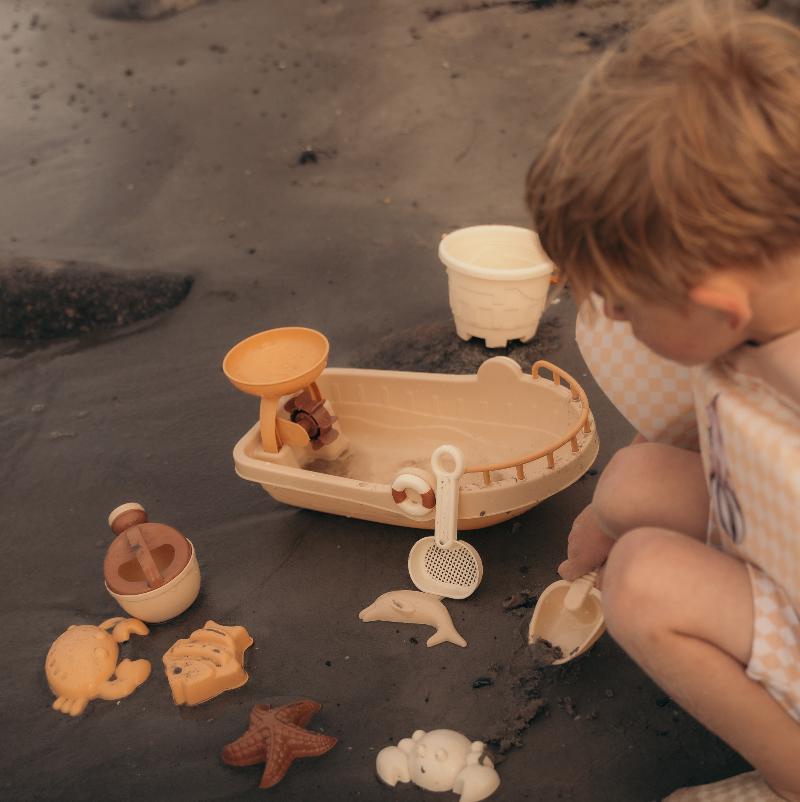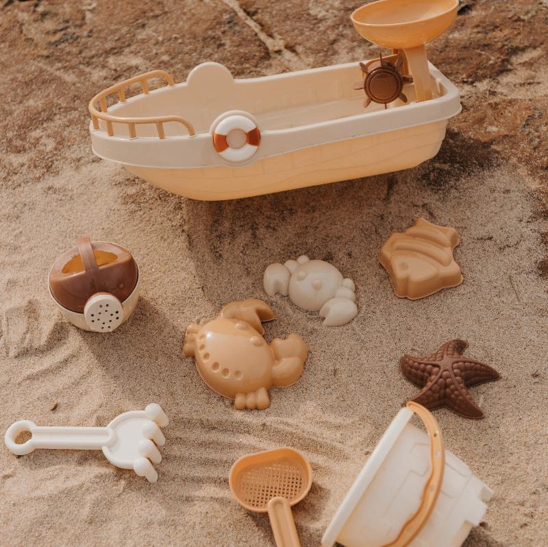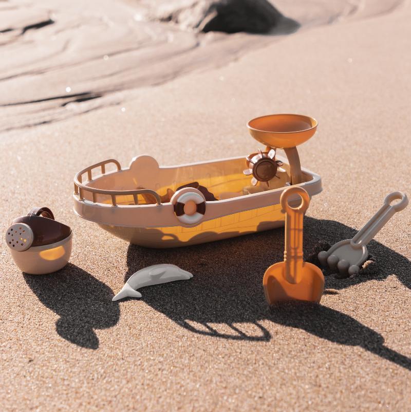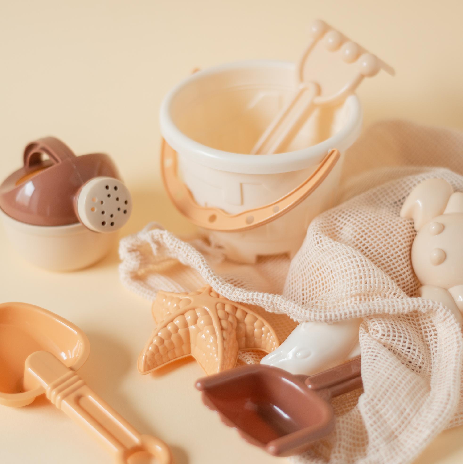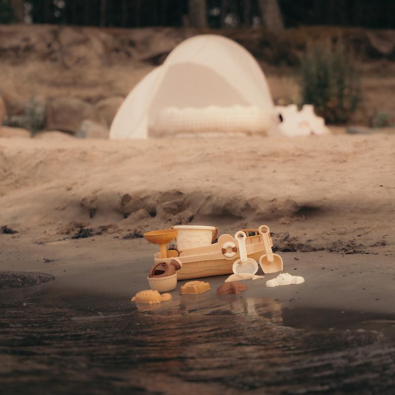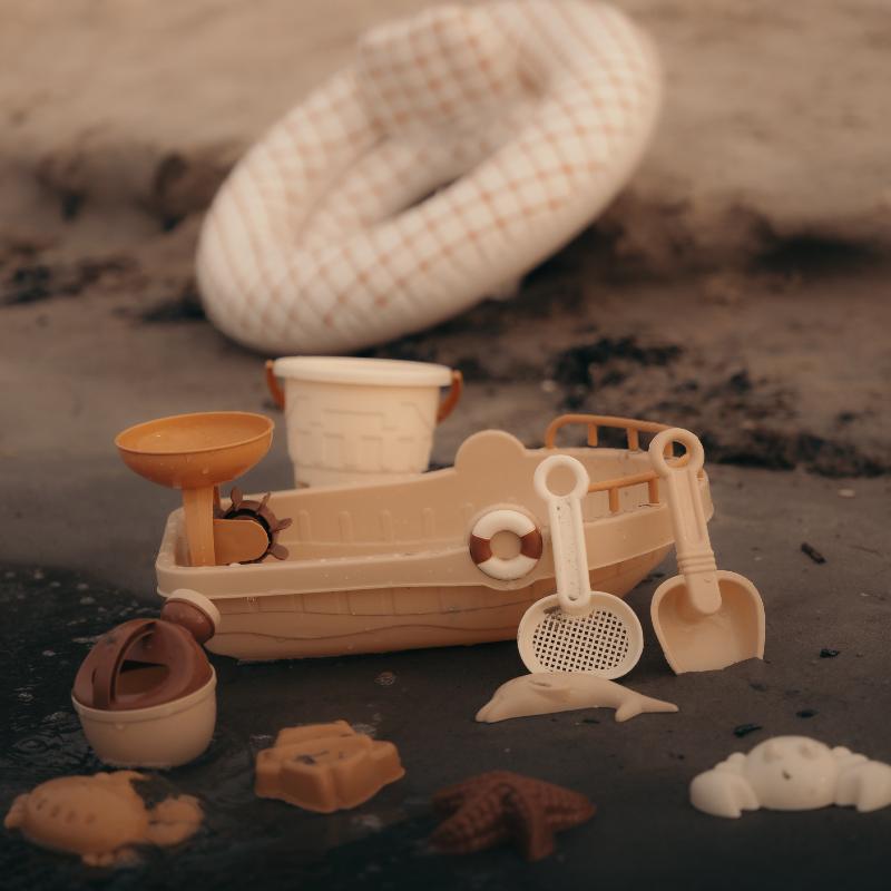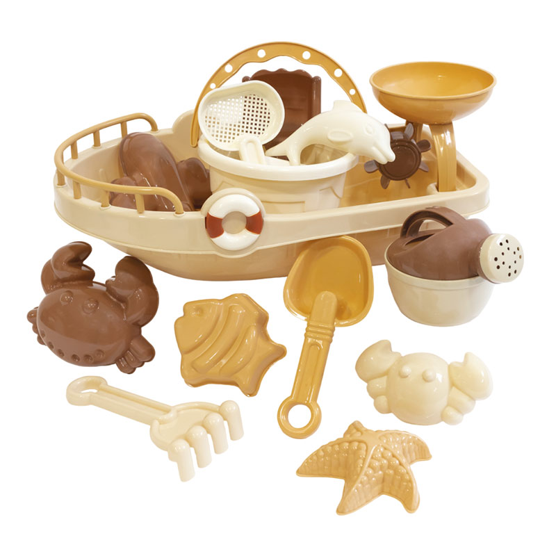 Настоящий пляжный арсенал для серьезных строителей замков! В наборе всё необходимое: несколько лопаток разных форм, формочки, ведёрко, лейка, водяная мельница и кораблик. Сделано из переработанного пластика — можно спокойно копать, лепить и возводить, зная, что планета в порядке. Набор выдержит активные игры не один сезон, а спокойные бежевые оттенки впишутся куда угодно.