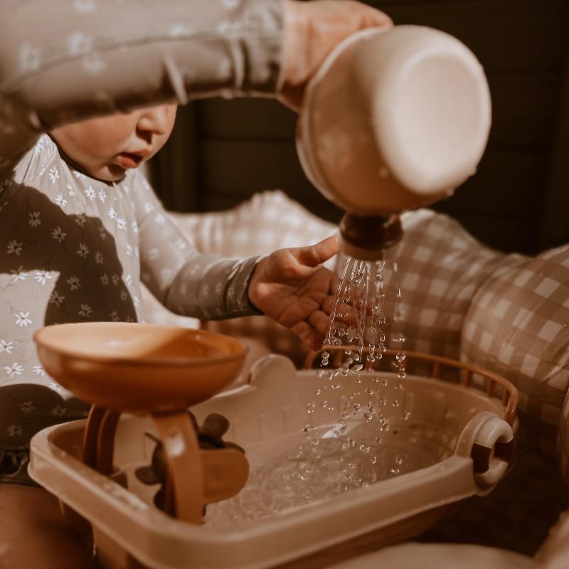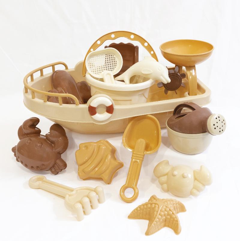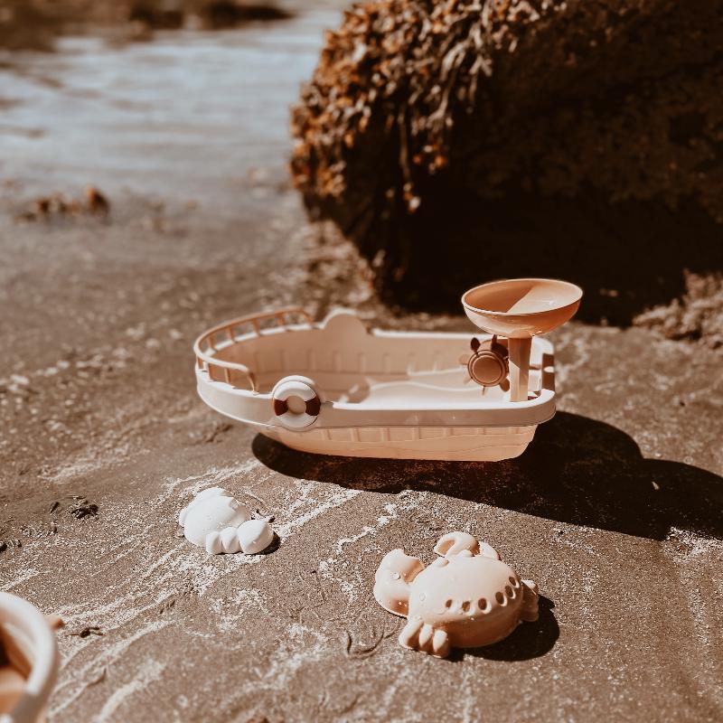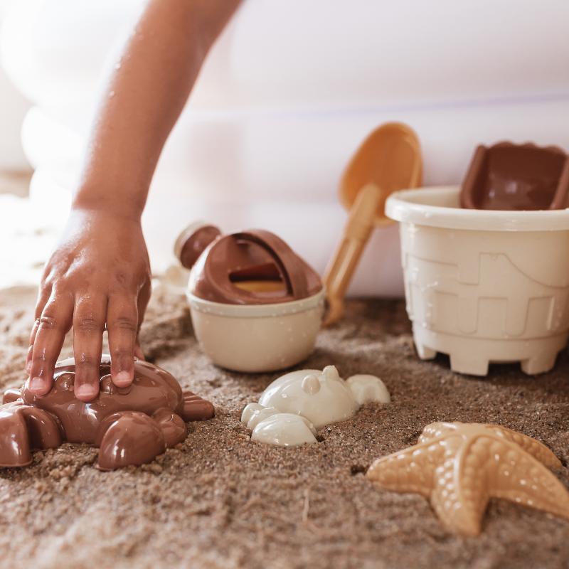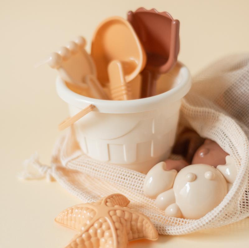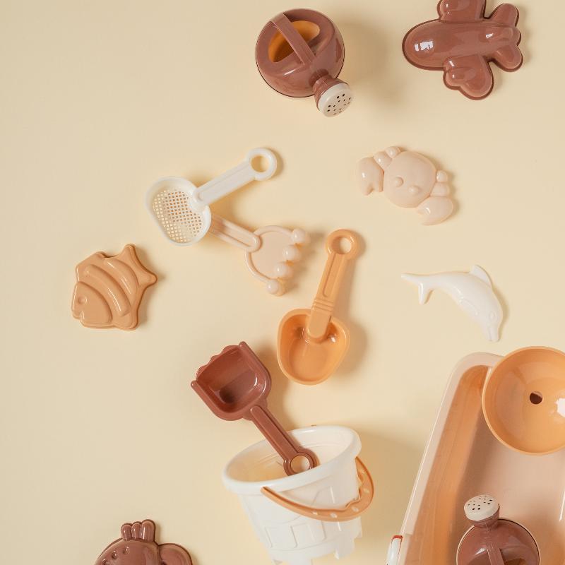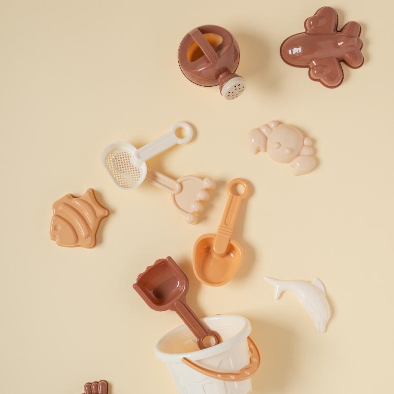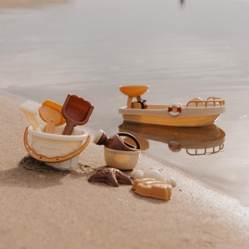 Настоящий пляжный арсенал для серьезных строителей замков! В наборе всё необходимое: несколько лопаток разных форм, формочки, ведёрко, лейка, водяная мельница и кораблик. Сделано из переработанного пластика — можно спокойно копать, лепить и возводить, зная, что планета в порядке. Набор выдержит активные игры не один сезон, а спокойные бежевые оттенки впишутся куда угодно.