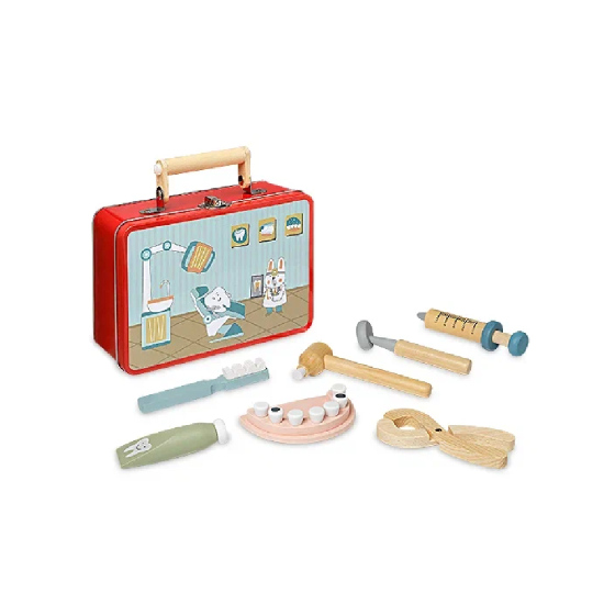 Дополнительная информация: в набор входит 8 предметов: чемоданчик, зубная паста, щетка, сверло, зеркало, щипцы, шприц, макет рта с больными и здоровыми зубами (извлекать можно только больные).