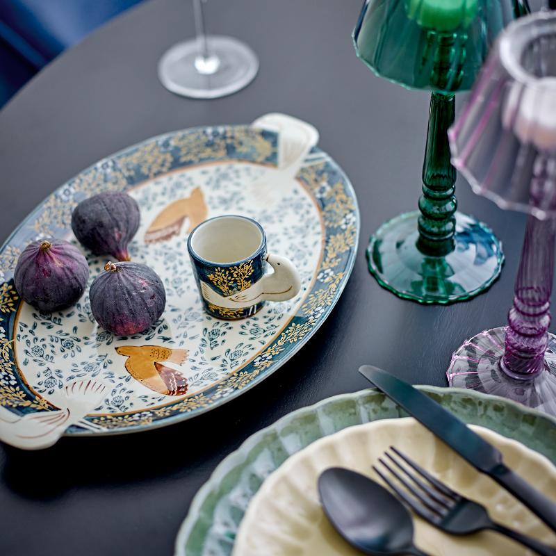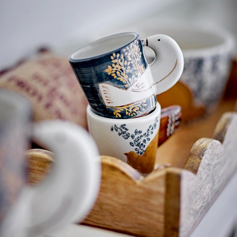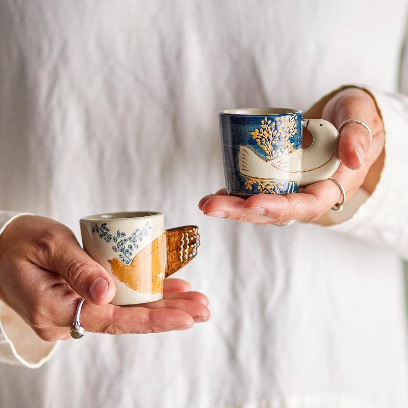 Две керамические чашки с птицами вместо ручек. Бело-голубая роспись вручную делает каждую чашку уникальной — крылья птицы становятся частью дизайна и функциональной ручкой одновременно. Набор из двух штук для утреннего эспрессо или вечернего ристретто. Керамика плотная, с приятным весом в руке. Датский бренд умеет сочетать легкость с элегантностью.