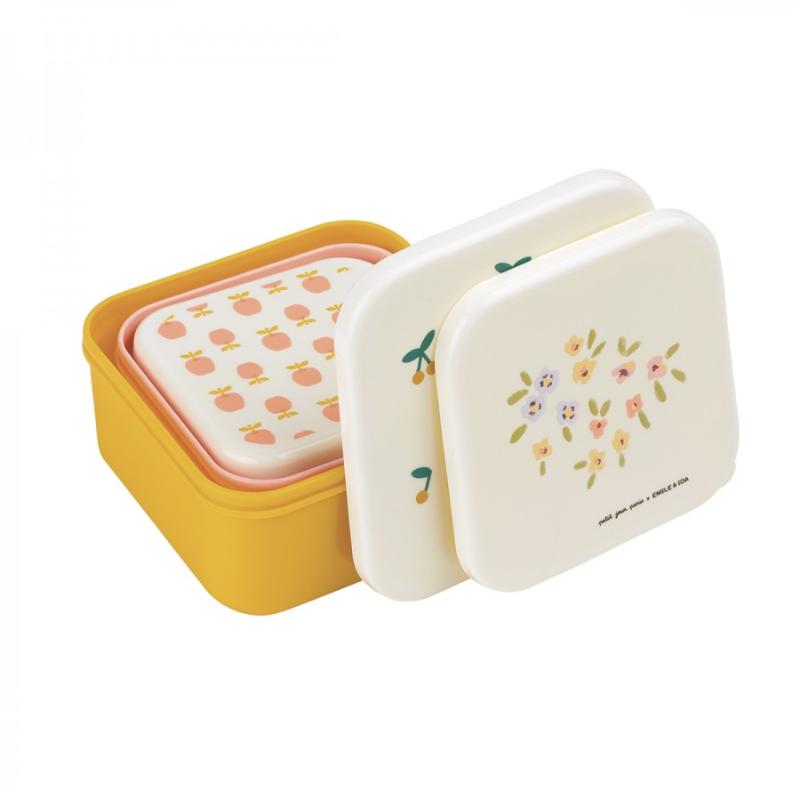 Три контейнера разного размера с нежными рисунками складываются один в другой. Большой для основного блюда, средний для фруктов, маленький для орехов или печенья. Крышки закрываются плотно, еда не высыпается по дороге. Яркие цвета с розовыми оттенками из коллекции Emile & Ida смотрятся мило и стильно. Можно мыть в посудомойке. Нельзя греть в микроволновке и замораживать. Контейнеры легкие, не утяжеляют рюкзак. Удобно брать в школу, на прогулку или в поездку.