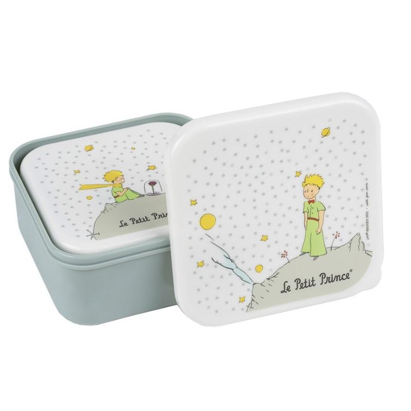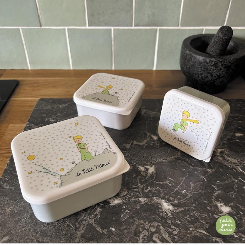 Три контейнера разного размера с иллюстрациями Маленького принца складываются один в другой. Большой для основного блюда, средний для фруктов, маленький для орехов или печенья. Крышки закрываются плотно, еда не высыпается по дороге. Серые оттенки с авторскими рисунками Экзюпери смотрятся стильно и спокойно. Можно мыть в посудомойке. Нельзя греть в микроволновке и замораживать. Контейнеры легкие, не утяжеляют рюкзак. Удобно брать в школу, на прогулку или в поездку.