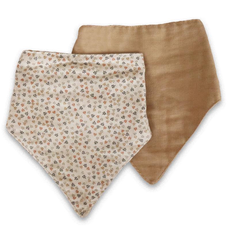 Два нагрудника из воздушного муслина — один с принтом листьев, второй в оттенке холодного кофе. Муслин мягкий, быстро впитывает жидкость и моментально сохнет после стирки. Благодаря лёгкости ткани нагрудники не стесняют движения малыша. В наборе две штуки, что удобно для частой смены в течение дня. Подходят с рождения.