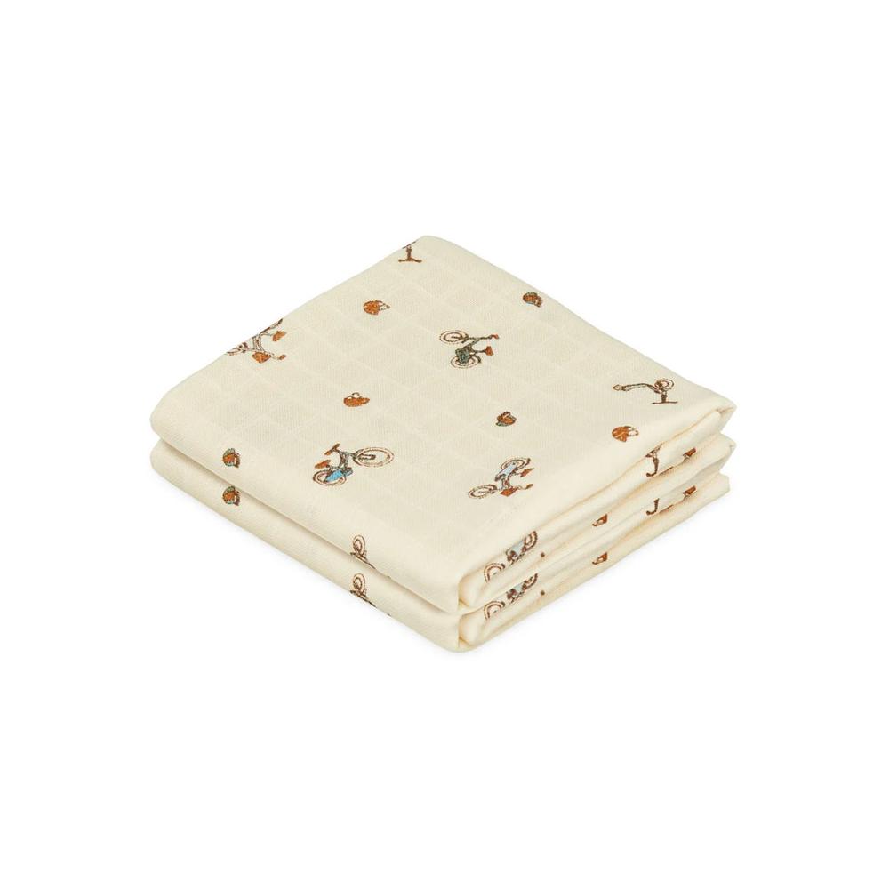 В набор входят две муслиновые пеленки размером 70 на 70 см, выполненные в мягком кремовом цвете из коллекции Bicycles. Пеленки изготовлены из натурального дышащего материала, который бережно относится к нежной коже малыша. Они подходят для укутывания, защиты от солнца или в качестве легкого пледа. Универсальность и практичность делают этот набор незаменимым в повседневном уходе за ребёнком.