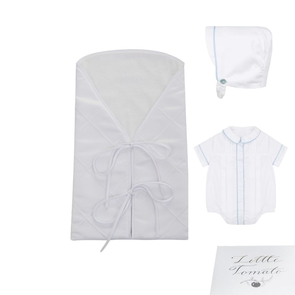 Классический комплект для выписки с голубым акцентом создаёт образ чистоты и спокойствия. Мягкая ткань не раздражает кожу, а лаконичный крой гарантирует комфорт. Голубой кант добавляет элегантности и придаёт традиционный мальчишеский штрих. Такой набор подчеркнёт важность момента, оставаясь универсальным, практичным и стильным. Он станет красивым началом новой истории — семейной и детской — в одном уютном, продуманном до мелочей комплекте.