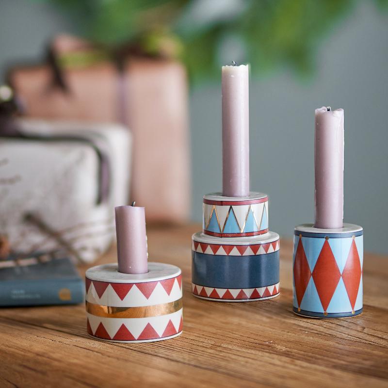 Три керамических подсвечника в форме барабанов с праздничными узорами. Бело-голубая роспись напоминает о рождественских традициях в современной интерпретации. Разные размеры создают ритм и объём в композиции. Керамика устойчива и безопасна для использования со свечами. Набор для тех, кто хочет отойти от классической красно-зелёной палитры.