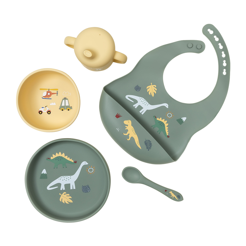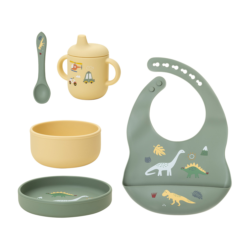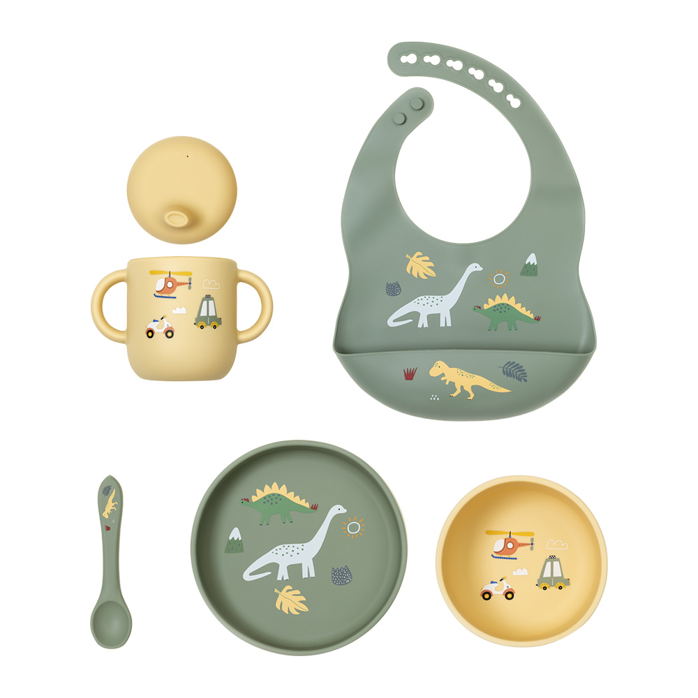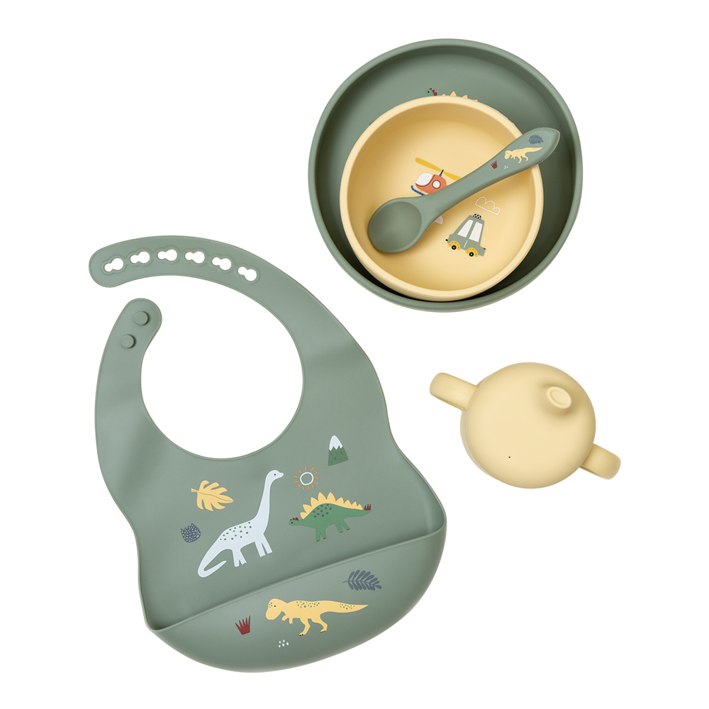 Насыщенный оливковый оттенок подарочного набора гармонично сочетается с ярким и озорным принтом динозавров, солнца и маленьких машинок. Такой комплект отлично подойдёт для маленьких исследователей, ведь еда с ним превращается в увлекательную игру. В набор входят тарелка, глубокая мисочка, поильник с крышкой, силиконовая ложка и нагрудник с удобной регулировкой.