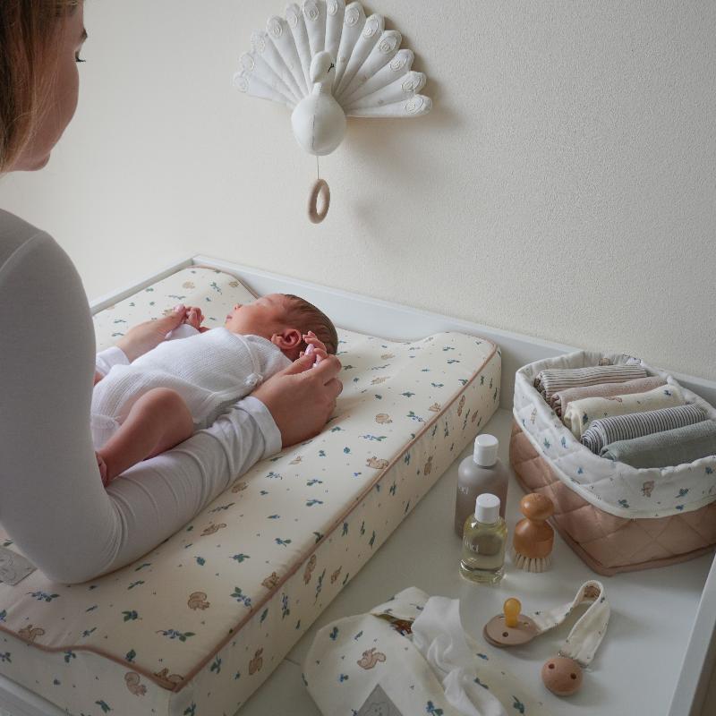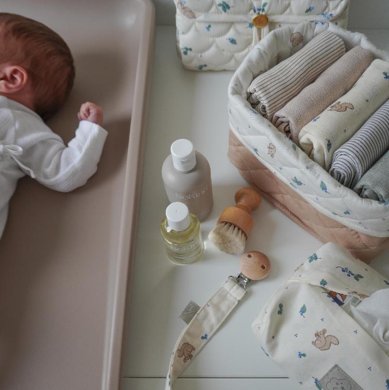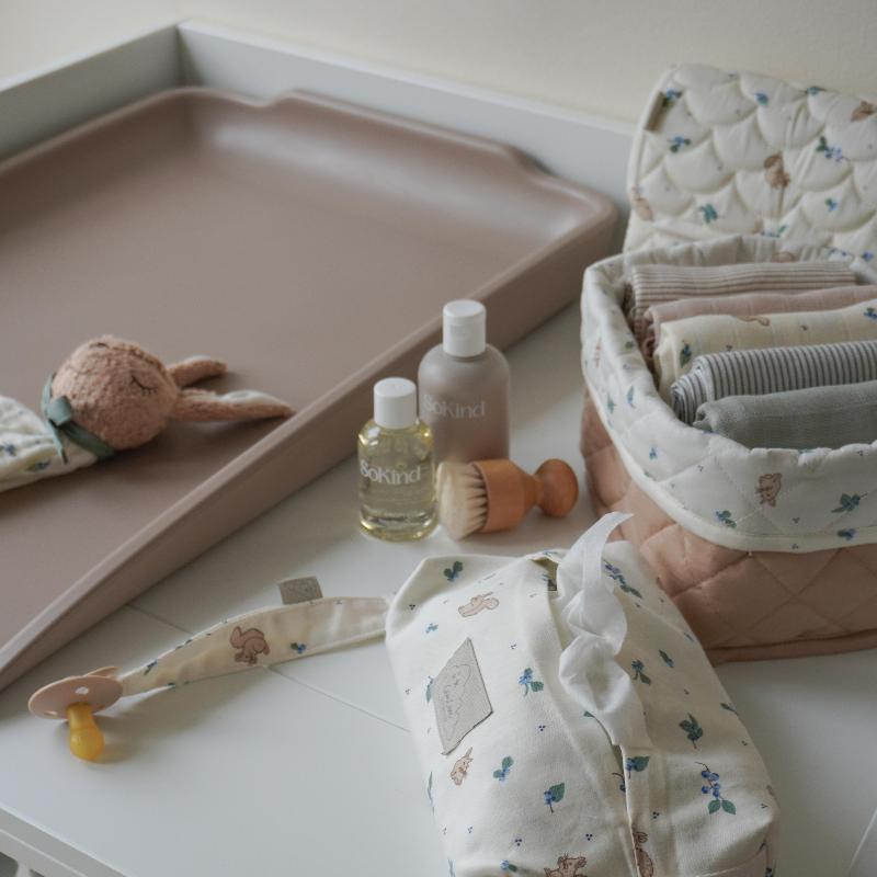 Корзины с принтом черники в двух размерах для удобной организации пространства. Сочетание молочного и карамельного оттенков выглядит свежо. Стёганая текстура держит форму, материал прочный и легко чистится. Большую корзину можно использовать для игрушек или пледов, маленькую — для подгузников, кремов или мелочей. Эти корзины работают не только в детской, их можно переставить в ванную или гардеробную. Практичное хранение с характером